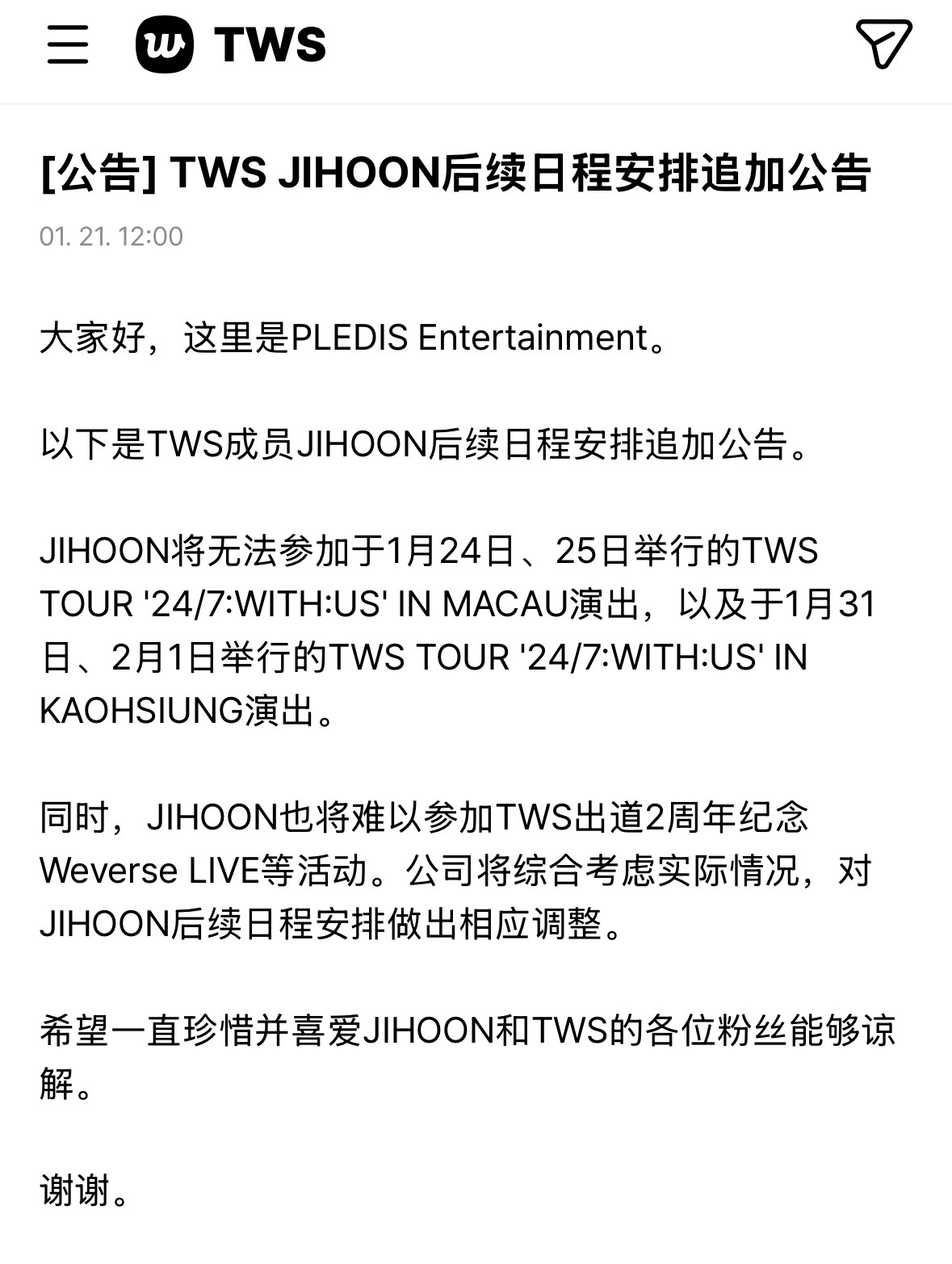 TWS韩志薰后续日程安排最佳公告,将缺席中国澳门高雄场演唱会和2周年纪念直播