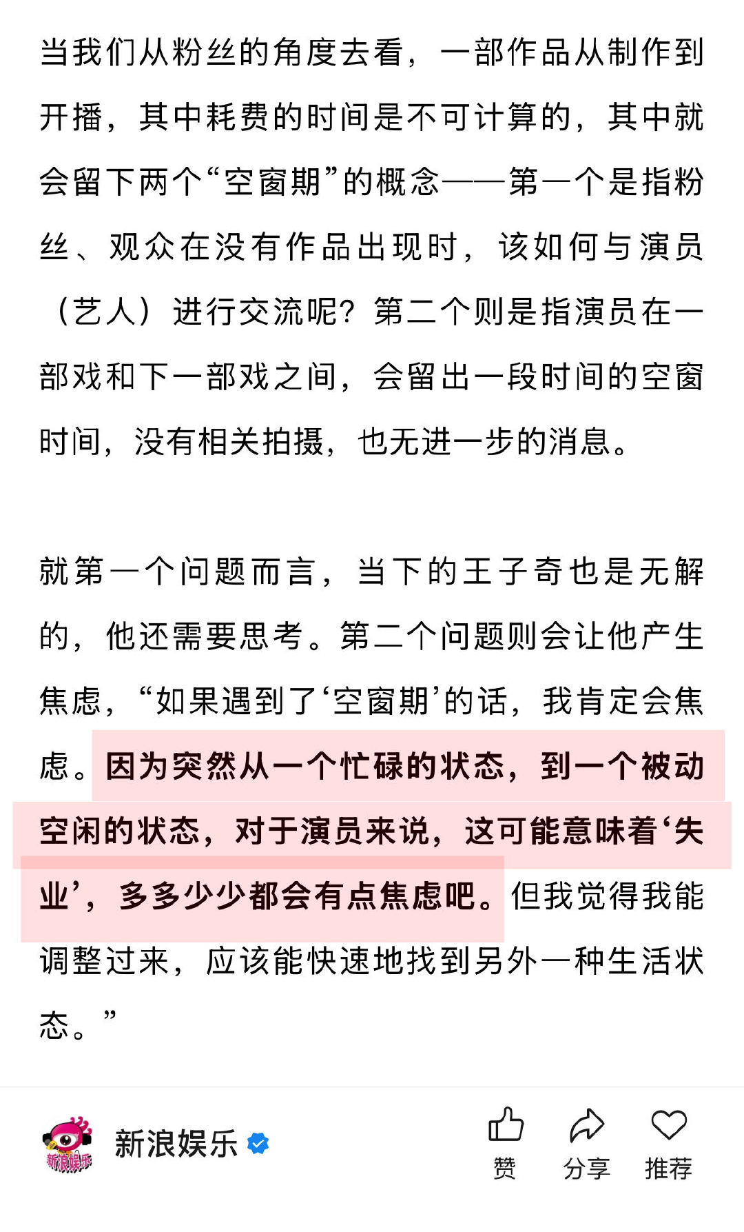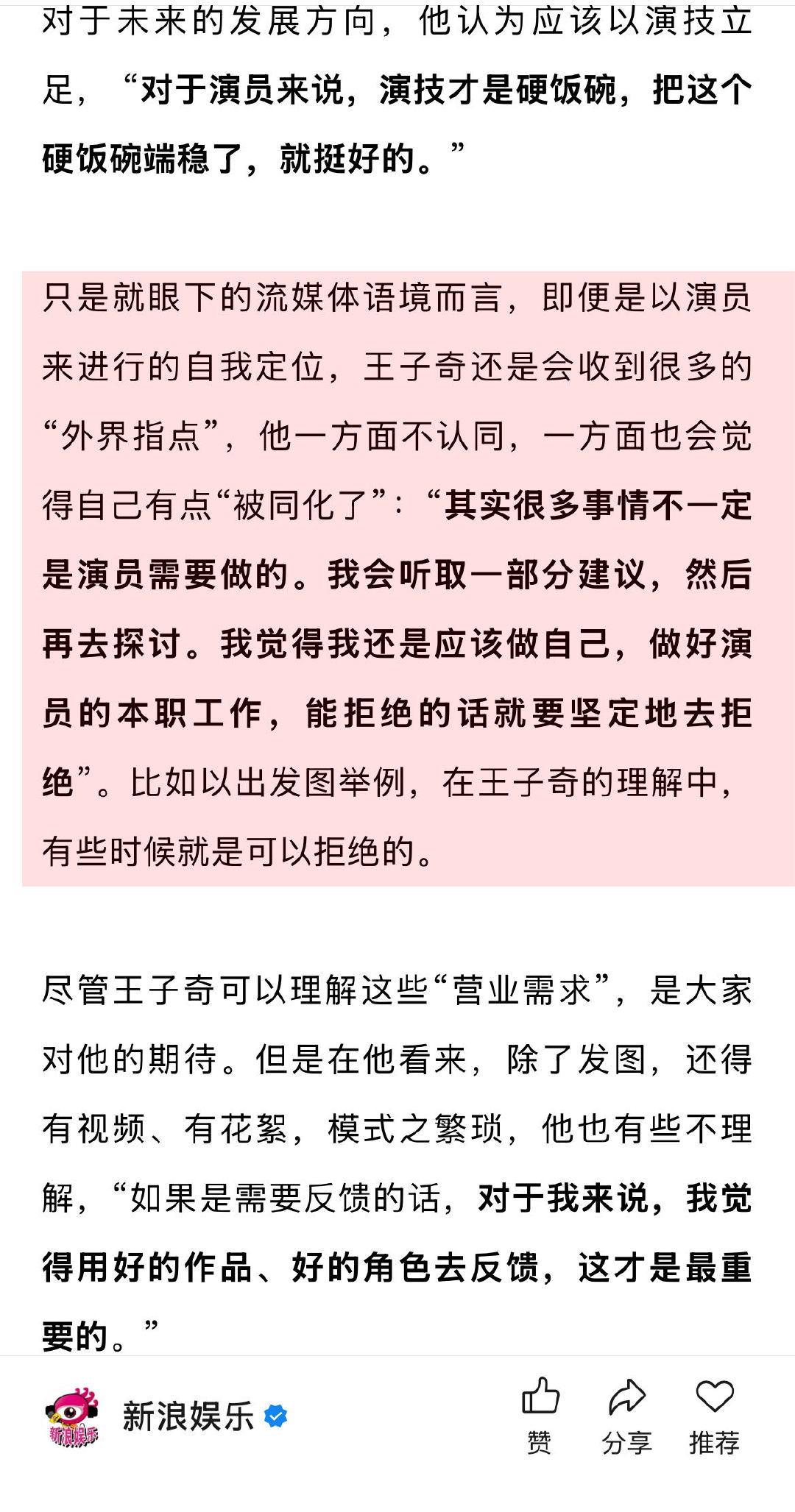 王子奇说自己无法拒绝萧瑾瑜 王子奇说年龄不是焦虑而是财富 谈及外界建议,直言:“其实很多事情不一定是演员需要做的。我会听取一部分建议,然后再去探讨。我觉得我还是应该做自己,做好演员的本职工作,能拒绝的话就要坚定地去拒绝”。比如以出发图举例,在他的理解中,有些时候就是可以拒绝的。↓