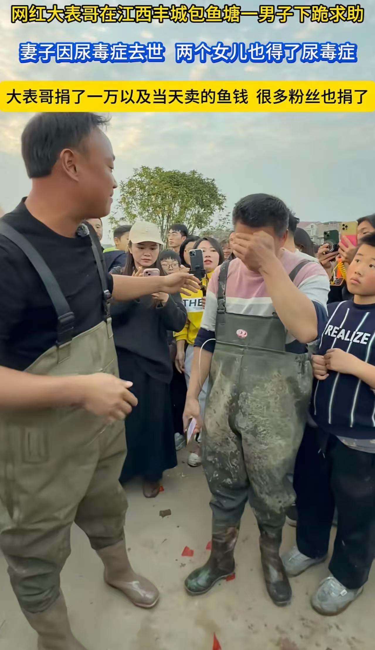 看哭了!老婆得了尿毒症,怕连累家庭自己喝农药走了,男子还没从悲伤中走出来,2个女儿又查出尿毒症晚期!他实在无力支付医药费,听到拥有千万粉丝的网红大表哥花10多万包下雷钟潭,跑过去就给大表哥跪下了……而大表哥的做法,令人怒赞! 这天,大表哥斥巨资包下了雷钟潭。这个鱼塘可不简单,据说有100多年没干过,塘主信誓旦旦地说里面有几万斤的鱼,要是捞上来,能卖50万呢! 大表哥一听,这生意有搞头啊,说不定能大赚一笔。于是,他喊上自己的团队,热火朝天地忙活了好几天,又是抽水,又是准备渔具。 可谁能想到,抽水抽到一半,意外发生了! 原来,这个鱼塘不仅深,结构还十分特殊,抽水到一半的时候,岸边一圈突然发生了塌陷。 不远处就是村民房屋,若强行抽干,恐致地基下沉、房倒人伤。大表哥果断下令停工,宁可亏钱,也不能冒风险害人。 可水没抽干,鱼就不好抓了,大表哥心里那个愁,这次亏大发了! 就在他望着半干的鱼塘发愁时,一个满脸风霜的男人冲过人群,正是顾大哥。 他满脸憔悴,声音哽咽地哀求:“大表哥,你帮帮我……我从江西上饶过来,为了两个女儿来求你。你们帮我发一个视频吧!我真的求求你了。我老婆尿毒症死掉的,两个女儿又尿毒症晚期!小女儿做了几个月的透析,左边眼睛瞎掉了。大女儿那个手都僵掉了,医生说要换肾,我真的没办法了,家里还有两个残疾的老人家,所以用这个方式求你帮帮我……” 说着,顾大哥“扑通”一声就跪在了地上。大表哥被这突如其来的一幕惊到了,连忙伸手扶起顾大哥,安慰道:“别这样,我喊拉网的师傅来拉鱼,到时候卖的钱全部资助给你,你等下也帮我们一起拉一下网,这个钱等你自己来挣!” 顾大哥听了,一脸的感激,赶紧换上打渔服,和一群拉网的师傅一起下了水。 在拉鱼的过程中,大表哥和顾大哥闲聊起来,这才得知了他这些年的悲惨经历。 顾大哥说,父亲脑溢血残疾已经20年了,这些年他一直不离不弃地照顾着父亲。 三年前,妻子查出尿毒症晚期,他借遍亲戚、卖光家当,带她四处求医。可妻子眼看拖垮全家,竟在一个深夜悄悄喝下农药,留下一句:“别再为我花钱了……” 当时家里欠了一屁股债,他咬着牙振作起来,努力工作还债。 可命运似乎还不肯放过他,两个女儿又先后患病,每个月一万多块钱的治疗费用,让他实在撑不下去了。 大家听了顾大哥的故事,心里都酸酸的,纷纷想着多拉点鱼,帮顾大哥多换一些钱。 第一网下去,没打上来多少鱼。大家没有气馁,接着打第二网、第三网,可这个鱼塘太深了,拉网的时候鱼总是从网里溜出去。最后,只搞到了670斤鱼,卖了1900多块钱。 这点钱对于顾大哥来说,简直就是杯水车薪,根本不够两个女儿的治疗费用。 而大表哥这边,也亏了十几万,但他没有丝毫犹豫,又转给顾大哥一万多块钱,希望能帮他缓解一下燃眉之急。 顾大哥接过钱,感动得热泪盈眶,嘴唇颤抖着,却一句话也说不出来。 之后,大表哥把这件事发到了网上,希望能让更多的人了解顾大哥的困境,伸出援手帮帮他。 视频发出后,无数网友泪目: “大表哥真男人!自己亏着钱,还把最后一点希望留给别人!” “这才是网红该有的样子——用流量传递善意,而不是收割眼泪!” “顾大哥太苦了,但大表哥让他‘亲手拉网挣钱’,既给钱,更给尊严——这才是最高级的善良!” 大表哥用行动证明:真正的善意,不是居高临下的施舍,而是蹲下来,和苦难中的人并肩作战。 他本可以借口“鱼没捞到”婉拒求助,也可以拍个视频赚波流量就走。 但他选择了最笨、最累、最亏的方式——亲自下场,陪一个陌生人,在泥水里打捞希望。 更难得的是,他让顾大哥“自己拉网、自己挣钱”,既解燃眉之急,又护住一个父亲最后的尊严。 这不是慈善,是共情;不是施恩,是尊重。 致敬大表哥——你抽干的不是鱼塘,是冷漠;你捞起的不是鱼,是人心。 愿世间多一些像你这样“亏钱也要救人”的傻子,因为正是这些“傻子”,才让这个残酷的世界,始终留有一束光。