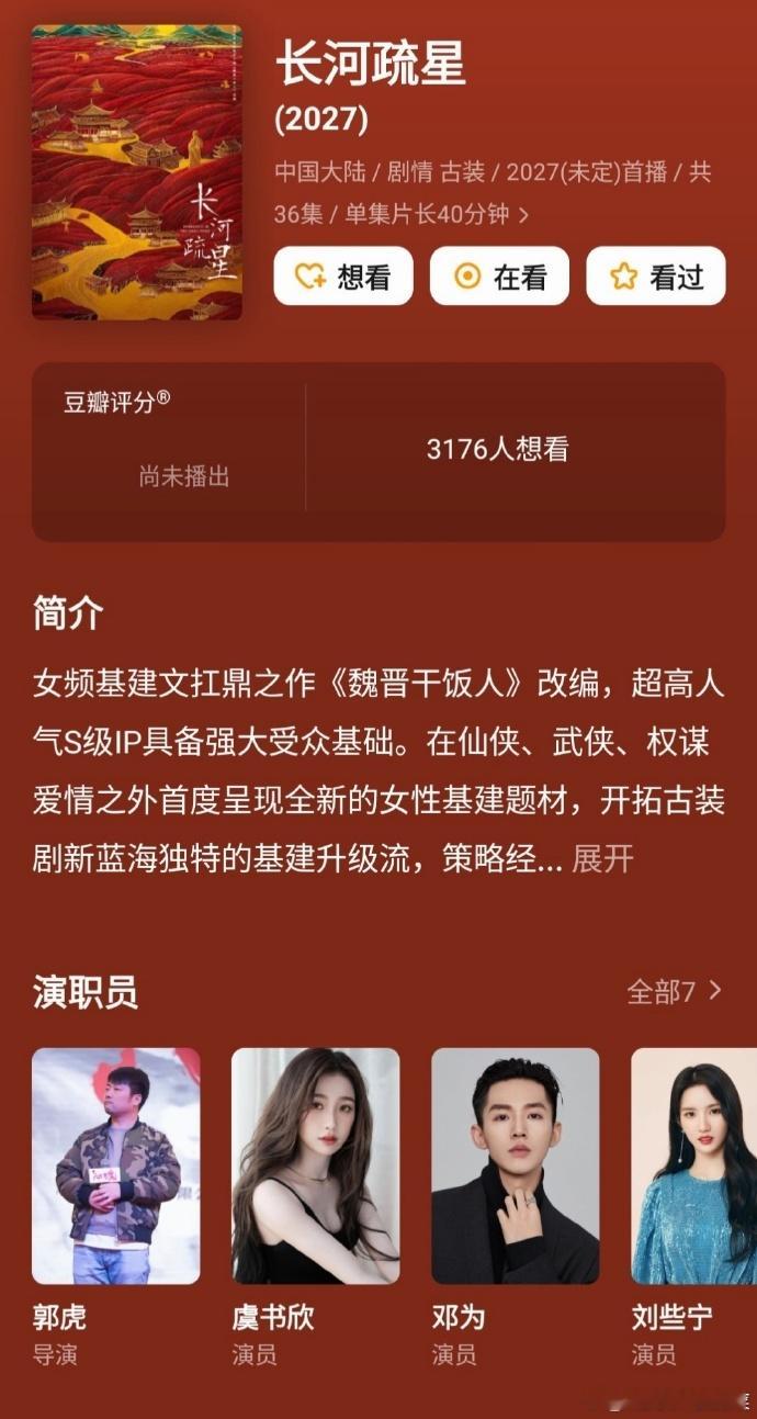 虞书欣邓为将出演长河疏星网传虞书欣将出演长河疏星 邓为古装实绩加持,网传与虞书欣共演《长河疏星》。演绎穿越乱世的基建情缘,IP底蕴与阵容热度双保障。