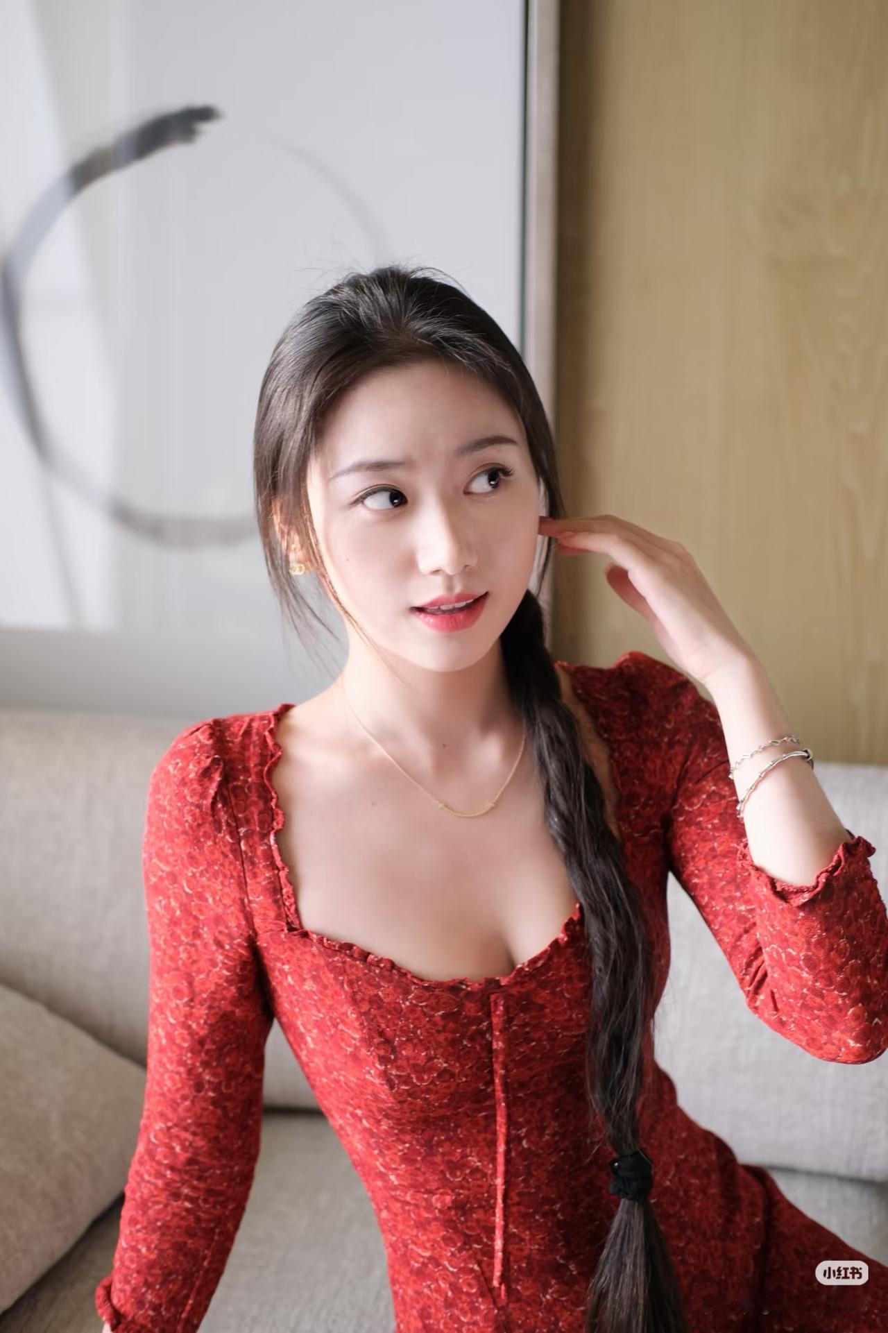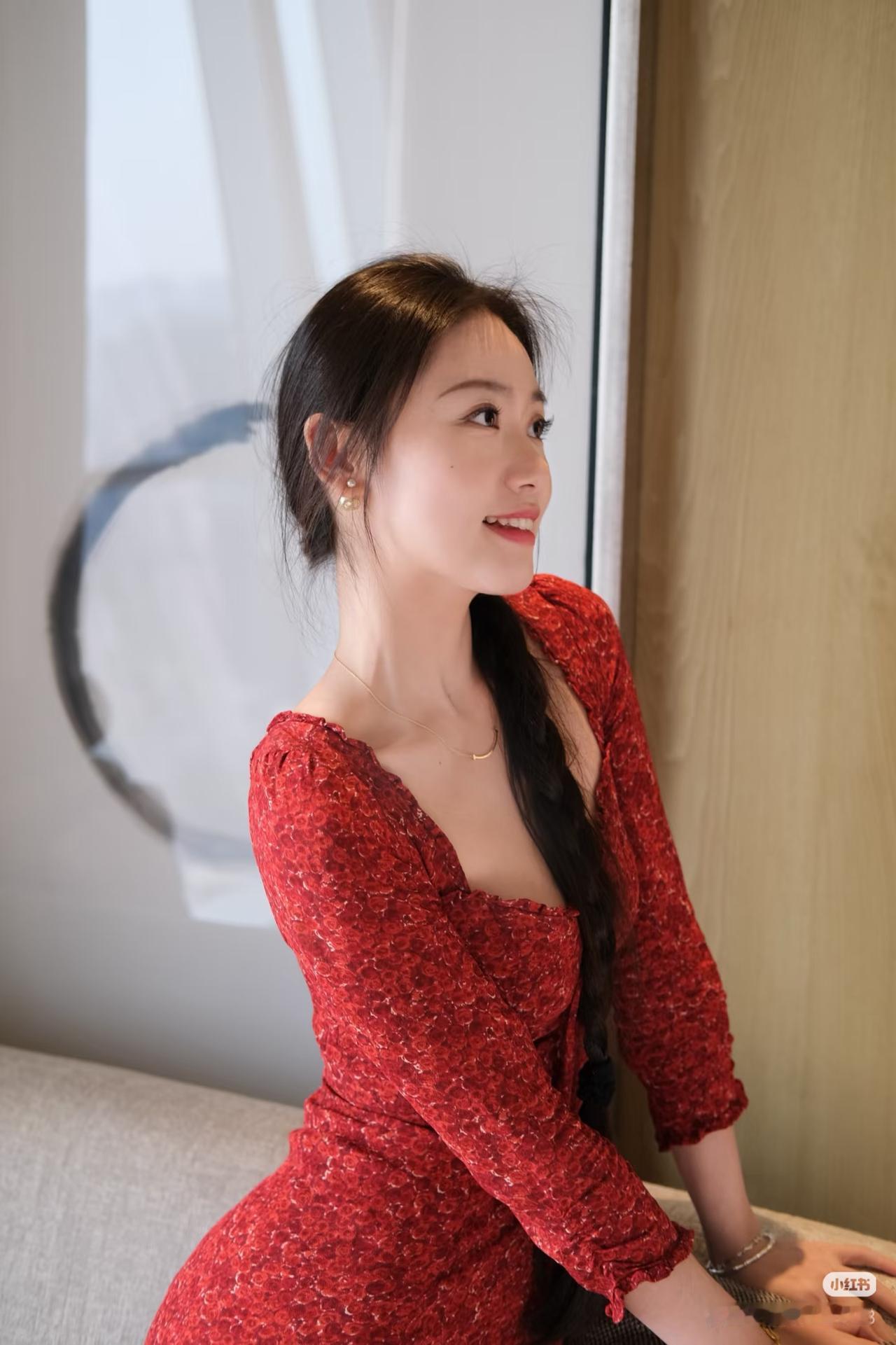 红衣美人倚窗坐,笑语如花映日红。