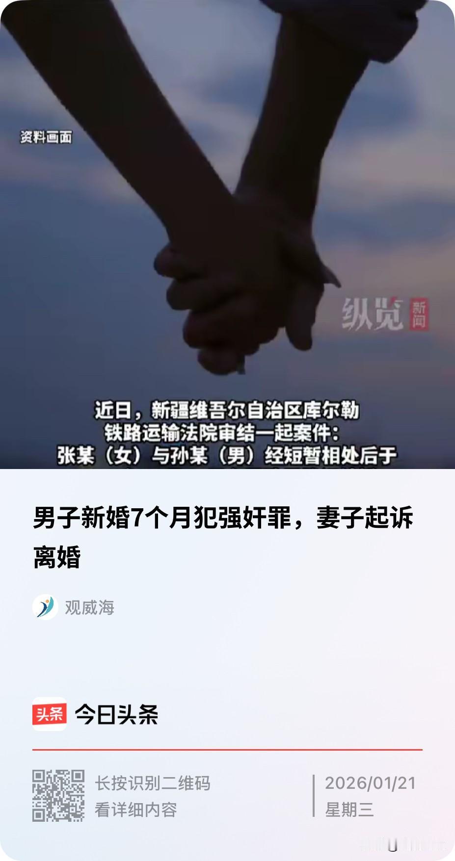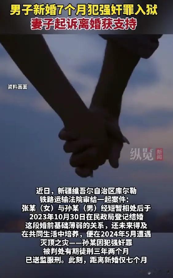 新疆,一男子刚和妻子结婚几个月,就因涉嫌性侵他人被判刑3年2个月,妻子表示难以接受,随即向法院提起了离婚诉求,希望法院能够判决双方离婚,而男子则希望妻子能给一个弥补和悔过的机会,最后法院会怎么判? 据悉,女子张某和男子孙某经人介绍相识,认识了没多久,23年10月30日,两人就匆忙领了结婚证,正式成了一对法律意义上的夫妻。 然而,让人无语的是,孙某明明已经有了妻子,而且还是刚刚结婚的情况下,孙某又对他人实施了性侵行为,24年5月,孙某因涉嫌强奸罪,被法院判处了3年2个月的有期徒刑,此时此刻,距离孙某结婚才7个月。 对于张某来说,刚刚结婚就遇到了丈夫做出如此不堪之事,这让让张某难以接受,因为也没有孩子的牵绊,张某向法院提起了诉讼离婚,希望法院能够判决两人离婚。 而孙某则表示,希望妻子能够给自己一个悔过的机会,不希望法院判决两人离婚。 事发后,有网友觉得,刚刚新婚,不应该做这种事情,真的是难以理解。 还有人说,判刑时间距离结婚时7个月,如果往前推,真正作案的时间只能更早,正常被刑拘到判刑,没有几个月根本下不来,所以,他们是刚刚结婚,男的就作案了。 那么,在这种情况下,法院会判决两人离婚吗? 其实,两人能不能离婚,关键要看感情是否破裂,按照女方的说法是已经破裂了,而男子却认为没有破裂。 民法典规定,有下列情形之一,调解无效的,应当准予离婚:(一)重婚或者与他人同居;(二)实施家庭暴力或者虐待、遗弃家庭成员;(三)有赌博、吸毒等恶习屡教不改(四)因感情不和分居满二年(五)其他导致夫妻感情破裂的情形。 本案中,男方的行为,如果是按照上述五种情况来适用,那么只能是第五种情形,即其他导致夫妻感情破裂的情形,也就是男方因实施性侵行为,违背了夫妻忠实义务,违背了公序良俗,导致夫妻感情破裂的原因。 加上两人结婚才短短几个月,根本就没有感情基础,所以,两人离婚也是毫无悬念的,最终,法院也是认定男方孙某的行为违背夫妻忠实义务,违背公序良俗,最终判决双方离婚。 幸运的是,幸亏没有孩子,不然的话,因为男方这种行为,最终不仅给自己带来了牢狱之灾,而且孩子的未来,也会因为父亲曾经有过故意犯罪记录,影响孩子的一生。 有人说,才3年多,等等也是可以的。对此就有网友反驳称,就是因为双方没有感情基础,没必要浪费三年时间去等一个人,等他出狱了,也不好找工作,两人过日子也是很艰难的,女方这是及时止损,还是很明智的。 对此,你对本案有什么看法? —————————— 关注我,带你评析法律热点,关注冷暖人生。 文章原创,抄袭必究