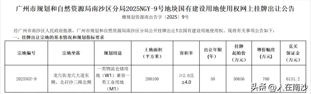 【深农在南沙项目即将开建!】广州南沙海吉星国际供应链有限公司发布深农全球农产品供应链加工中心工程施工总承包招标公告。公告显示,项目位于南沙区龙穴岛扬帆路西侧、北孖沙三路北侧地块,总用地面积300亩。 项目最高投标限价99451.435327万元,总建筑面积合计约为449493.32㎡,主要建议内容包括: ▲交易区A1至A8,建筑面积暂定352018.84㎡ ▲配套区C1、C3,建筑面积暂定62898.94㎡ ▲污水处理厂D1,建筑面积暂定576㎡ ▲附属用房A2-1、A3-1,建筑面积暂定1929.34㎡ ▲连扳与坡道,建筑面积暂定32370.2㎡ 项目计划施工总工期为1100个日历天,暂定开工日期为2026年3月。 据了解,项目用地正是去年5月被南沙海吉星国际供应链有限公司以底价30656万元竞得的2025NGY-9地块。而南沙海吉星公司是深圳市农产品集团股份有限公司旗下公司。 项目建成后,将打造成为区域农产品集散中心,将助力南沙成为大湾区乃至华南地区国际农产品流通枢纽。