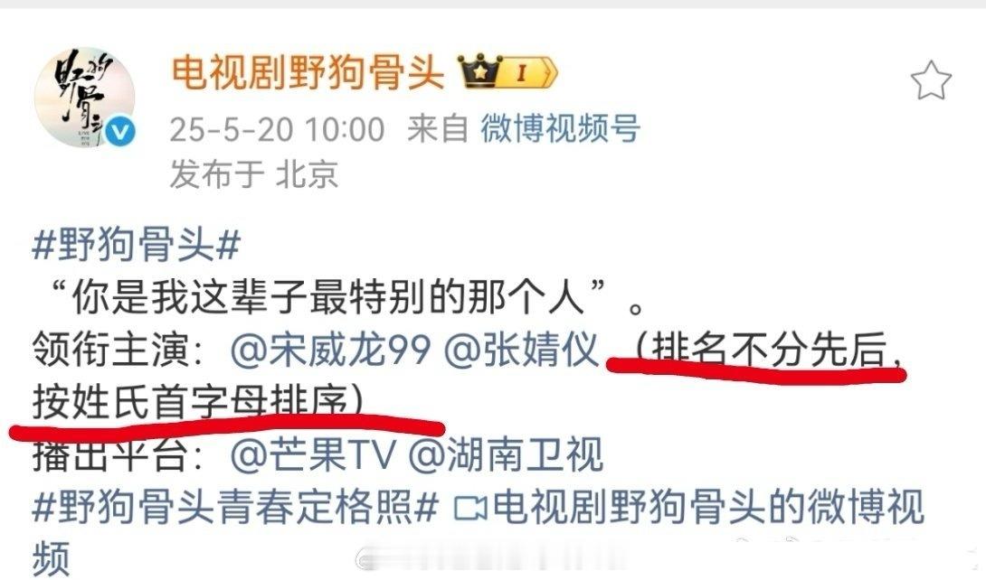 野狗骨头的番位 y1s1,虽然是平番,但是平在前还是平后,是有略微差别的。要不然怎么是按姓氏排,宋威龙在前张婧仪在后,比一番二番好听些。内娱是连海报都要争,为了番位花样百出的地方。不过如果像日娱那样,顺位第一扛扑爆,剧播不好开记者会道歉,配角加戏这些原因统统不算,估计就会你好我好大家好一片和谐了。 野狗骨头 张婧仪有打火机宋威龙有骄阳