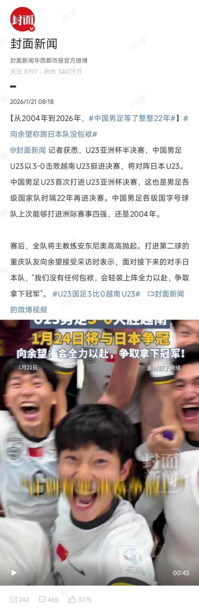 中国男足等了整整22年中国球迷真的挺实在的,只要你踢得好,就往死里夸。中国男足各级国字号球队上一次晋级洲际赛事决赛是2004年:成年国家队在本土亚洲杯决赛负于日本,U19国青则在亚青赛决赛不敌韩国,两次均获亚军。这次夺冠机会不大,日本队还是太强大了,不过梦想还是要有的,万一实现了呢?老张聊体育