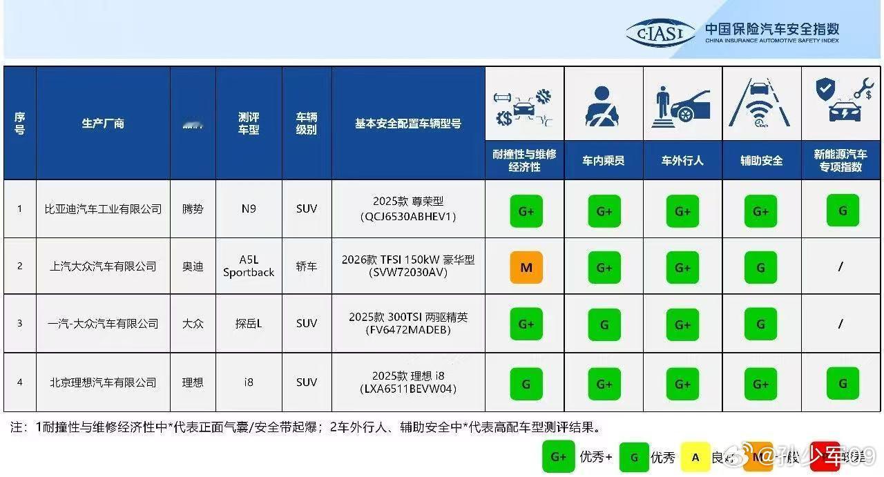 腾势N9、奥迪A5L Sportback、大众探岳L、理想i8中保研测试成绩大家都是优秀以上,只有奥迪碰撞经济性是M 一般
