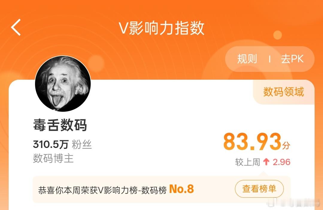 恭喜毒舌数码再次进入V影响力榜前10,再接再厉