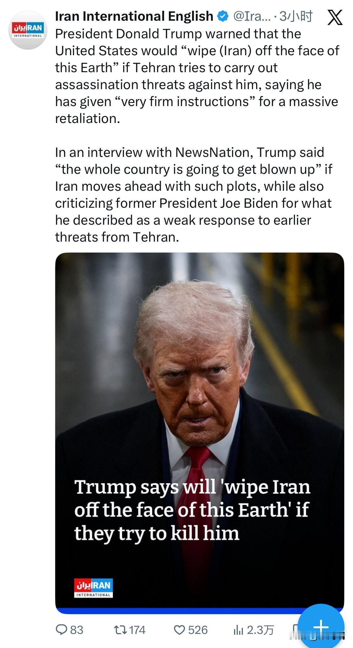 美国总统唐纳德·特朗普警告说,如果德黑兰试图对他实施暗杀威胁,美国将“将伊朗从地球上抹去”,并表示他已下达“非常明确的指示”,要进行大规模报复。 特朗普在接受 NewsNation 采访时表示,如果伊朗继续实施此类阴谋,“整个国家都会被炸毁”,同时他还批评前总统乔·拜登对德黑兰早前的威胁反应软弱。