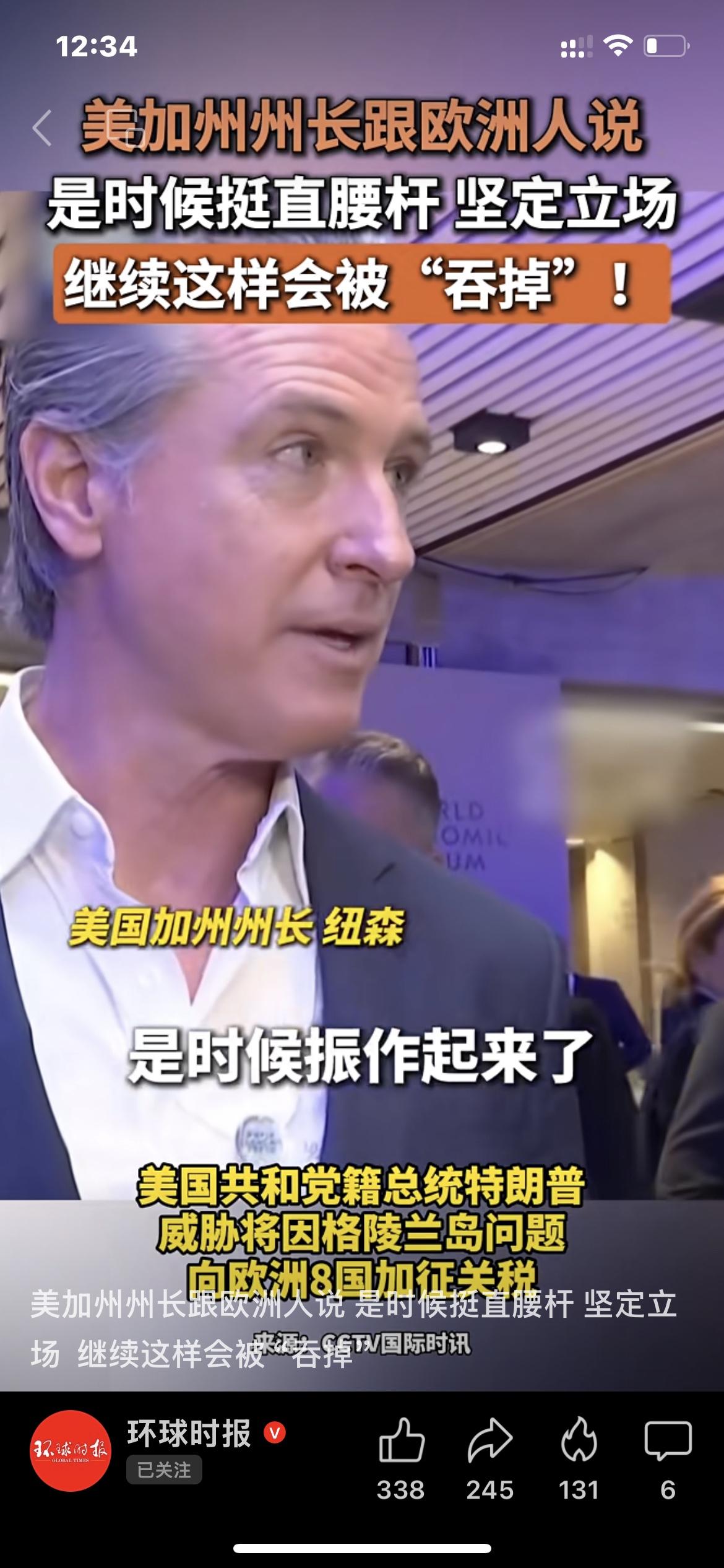 加州州长抨击欧洲领导人软骨头,要送他们护膝了 环球时报1月21日报道,美国加州州长纽森在瑞士达沃斯论坛年会期间上,公开批评欧洲领导人“软弱无能”。在格陵兰问题上,特朗普把欧洲领导人当傻瓜,他们应该“挺直腰板,坚定立场,拿出骨气”,不再充当特朗普的“共谋”。“应该给那些欧洲领导人戴上护膝”。这太令人尴尬了。 议论两句:这个抨击太准确太有力了。几十年来,欧洲依赖北约和美国,已经被豢养得毫无斗志,变成低能儿了,在特朗普发出侵略威胁时,竟毫无作为。不是不为也,而是不能也。