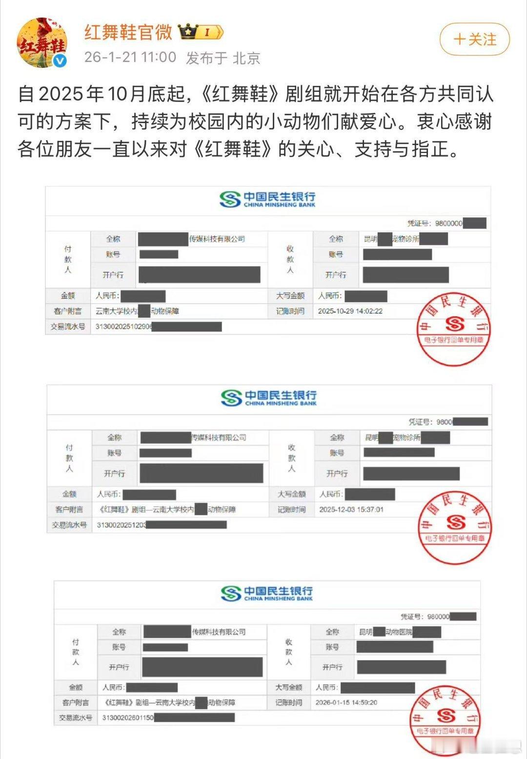 红舞鞋剧组与各方早有相关约定,因保密条款无法第一时间公布捐款,现在公开是给网友一个结果,款项在推进就是好事,别被带节奏啦~