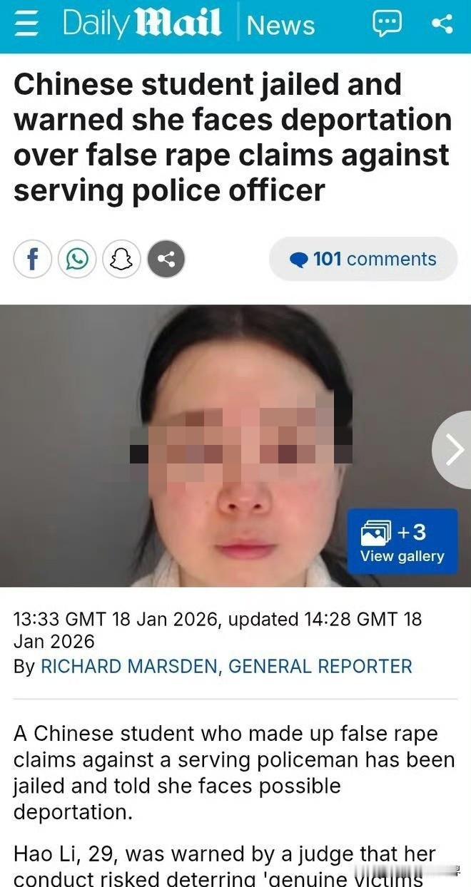 29岁中国籍女留学生诬告英国男警员强奸,最终被判6年徒刑。 英国《每日邮报》报道,涉事的李姓女子为29岁的中国籍的硕士研究生。 2024年11月,李某在英国留学期间,与一名事发时非值勤的英国警察自愿发生关系。然而,事后还不到半小时,女子却报警指控遭到对方性侵,该警察被捕。 该女子没有想到的是,被他指控的这个警察在事发前偶然录下双方对话,录音完整记录了双方发生关系的过程。是李某主导互动,并非该警察用强,结果不言而喻。 法庭根据警察提供的录音事实证据,于今年1月16号,以李姓女子诬告及妨碍司法公正,判处李姓女子6年徒刑。 我只想说一句活该,判的真好。 显然李姓女子这是把小仙女经常在国内用的那一套手法拿到英国用了。只是人家英国法庭根本不惯她,一切都是以证据法律来行事。 这再次证明拍视频自证的重要性,幸好英国那边没有知心大姐姐,否则即使你有录音对小仙女也无用,东方这边类似的案例已有好多起了,结果在知心大姐姐的开导下,别说判刑了,甚至连向被他诬告的男子道歉都没有。 真希望东方也学一学这个诬告有罪,尽快实行。 有人不理解,这女子这么做是为什么? 还能为什么,一个是为入籍,一个是为钱。 若不能顺利入籍就反告来敲诈。 因为这种事在东方,小仙女是屡屡得逞。 这次小仙女之所以没有得逞,是因为她看懂当地国情,她以为英国也像东方一样对她们偏心,再者人家那里没有知心姐姐,即使有知心姐姐也与她不知心。 这女的不就是牢a说的女留子,这下实锤了,还是英国人锤的。 尤其是英国还把犯人的名字照片都公布了,这一点值得称赞。 真希望东方也能学学。 不为别的,起码能让后来者不趟雷。 就像这个女的,以后她便是在英国行骗了,徒刑期满后回国,也不好再行骗了。 图片我给打码的,英国敢公布,我可不敢。