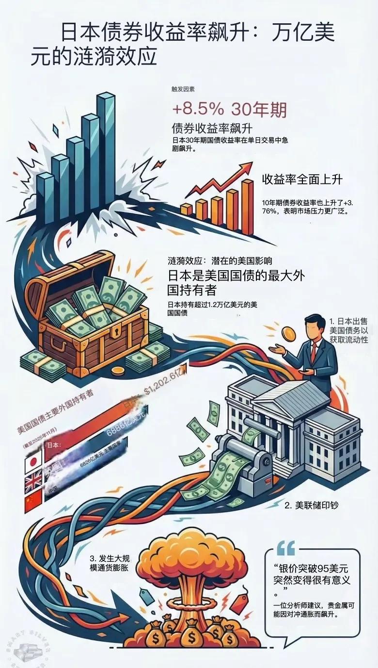 【重要信号】日本国债崩了,白银要飞了?🚨🥈 日本债券市场刚刚发出了一个极其危险的信号:日本30年期国债收益率单日暴涨 +8.5%! 别以为这只是日本自家的事,对于全球负债最重的发达经济体来说,这不仅是压力测试,更可能引发全球金融海啸。🌊 👇 为什么你需要关注这件事?逻辑非常清晰: 1️⃣ 谁是债主? 日本是美国国债的第一大外国持有者,手里攥着大约1.2万亿美元的美债。 2️⃣ 发生了什么? 收益率飙升意味着债券价格暴跌,日本国内的流动性压力骤增。 3️⃣ 后果是什么? 为了救急,“泄压阀”只有一个——抛售美国国债换取流动性。 📉 一旦日本开始大规模抛售美债: ➡️ 美国国债收益率将被迫飙升; ➡️ 美联储不得不下场“接盘”; ➡️ 印钞机重新加速轰鸣; ➡️ 最终结果:通胀失控,蔓延全球。 这绝不是一个局部的小感冒,而是会直接冲击美国金融体系核心的重感冒。 🔥 结论来了: 在这样的宏观背景下,白银价格冲上95美元,突然就变得非常有逻辑支撑了。这不仅仅是通胀预期,更是对信用货币体系动荡的直接避险反应。