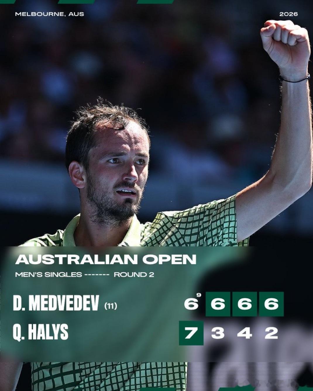 梅总真的回来了?梅德韦杰夫击败阿里斯 6-7 6-3 6-4 6-2梅总自2021年以来首次以7胜0负的战绩开局。他那年做了什么?他打进了澳网决赛,还赢得了美网冠军。恭喜梅总✅第7次打进澳网第三轮✅自2024年以来首次在大满贯赛事中进入第三轮梅总回归!这很澳网澳网2026ATP 梅德韦杰夫晋级澳网32强