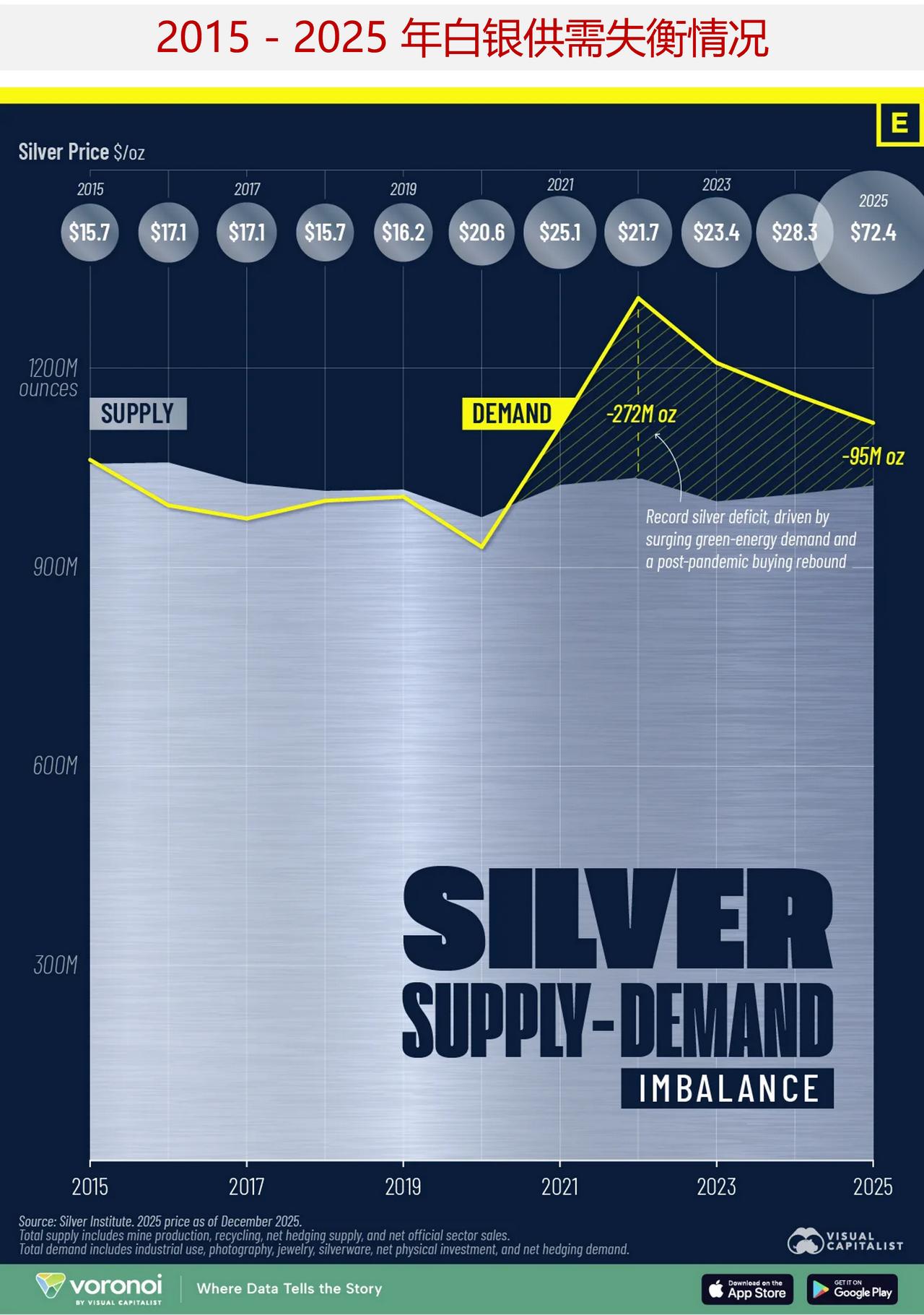 图说2015 - 2025 年白银供需失衡情况 2026 年年初,白银价格再次出现强劲反弹,随着市场基本面的收紧,价格不断攀升至新高。 期货价格已涨至 85 美元以上,这一涨势是由中国实施的出口限制、绿色技术领域需求的增加以及人们对白银作为避险资产的兴趣再度高涨所推动的。 下面这张图表清晰地展示了过去十年间全球白银的供应量和需求量发生了怎样的变化。 尽管供应增长一直较为平稳,但需求却大幅上升,由此引发了一系列结构性失衡问题,这些失衡正在重塑市场格局。 此可视化图表所依据的数据来自“银业研究所”。银的总供应量包括矿产开采量、回收量、净套期保值供应量以及净官方部门销售量。银的总需求涵盖工业用途、摄影、珠宝、银器、实物投资以及净套期保值需求。 ——自 2021 年以来的持续性供应赤字 在经历了数年的小幅盈余之后,银市在 2021 年转为出现赤字。2021年,银的需求量猛增至 11.12 亿盎司,而供应量则仅为 10.23 亿盎司。 这种失衡状况在 2022 年急剧加剧,当时需求飙升至创纪录的 13.06 亿盎司。这导致了有史以来最大的缺口,达 2.72 亿盎司,标志着市场的一个转折点。 ——绿色能源推动了需求的增长 白银需求激增的主要驱动因素在于其在绿色技术领域的重要作用。太阳能电池板、电动汽车以及电力网络基础设施都高度依赖白银的导电特性。 2022 年,绿色能源需求大幅增长,同时受新冠疫情后珠宝、金条和硬币购买量回升的影响。即便在 2023 年之后需求略有放缓,但仍保持在较高水平。
