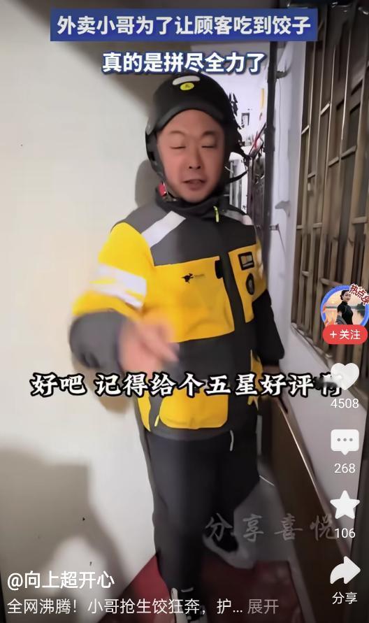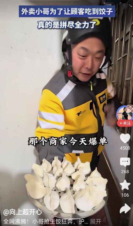 “这必须给好评!”一女子晚上不爱做饭,就在网上点了份饺子,可左等右等也不见外卖送到,正当她有些不耐烦时,外卖小哥突然敲门,可女子一开门,却发现饺子是生的,而小哥接下来的一句话,却让女子气全消了 当时,女子还没反应过来,毕竟以前点饺子都是一整盒送过来,但这次递过来的竟是一盘生饺子,连篦子都一起端来了。女子当场质问:我点的是水饺,你怎么给我哪个生的过来? 随后小哥急匆匆解释:商家今天单子太爆,后厨根本煮不过来,几个外卖员都快急眼打起来了,我瞅了个空档,自己进厨房端了一盘就赶紧跑,甭管什么馅,您自己煮一下就能吃 女子听完后愣了愣,问那这篦子怎么办?小哥摆摆手说,留着您用吧,记得给个五星好评就行! 这事传到网上,好多人听完倒乐了。有人说,这必须给好评啊。第一,生饺子说明肯定是现包的,不是冷冻货;第二,人家没工夫煮,连篦子带饺子都多送你了;第三,小哥也实在,抢到啥送啥,这份拼劲值得一个五星 这件事虽然看起来有些搞笑,但从中我们不难看出外卖小哥的职业态度,很多人为了节省时间选择外卖,而外卖小哥成了许多家庭饮食生活的“隐形英雄”。他们要应对各种突发情况,有时工作压力大、订单量大,做不完的事情也得尽力去解决 正如这次事件,虽然有点不寻常,但他们选择了不放弃,尽力满足客户的需求,即便是送生的饺子也不忘提醒客户煮熟了吃