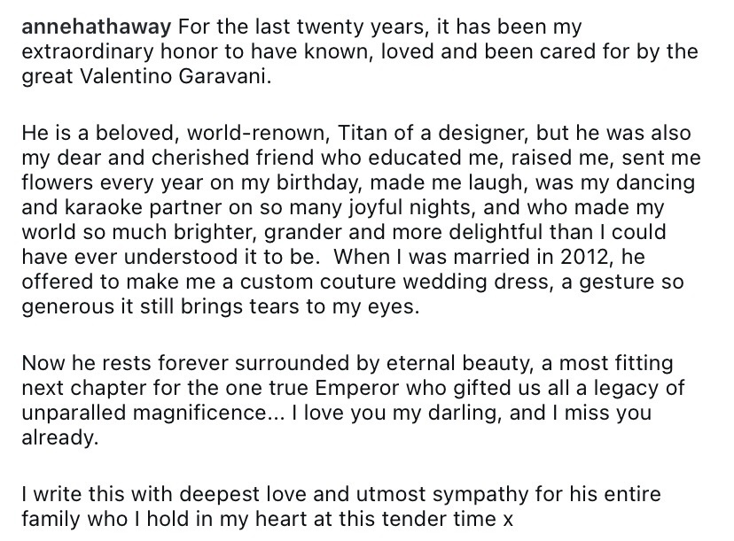 华伦天奴去世 安妮·海瑟薇发文悼念:「过去二十年来,能有幸结识伟大的瓦伦蒂诺·加拉瓦尼,得到他的关爱与呵护,于我而言是莫大的殊荣。他是备受爱戴、享誉全球的时装泰斗,更是我珍视的挚友——他给予我教诲与滋养,每年为我送上生日鲜花,在无数欢愉之夜与我共舞欢歌。他让我的世界绽放出超乎想象的光彩、辽阔与喜悦。2012年我结婚时,他主动提出为我定制高级婚纱,这份慷慨至今想起仍令我热泪盈眶。如今他长眠于永恒之美中,对这位赋予世间无与伦比华彩的时尚大帝而言,这无疑是最恰如其分的生命续章……亲爱的,我爱你,此刻已开始思念你。谨以此文寄托最深切的爱与哀思,并在此感伤时刻,向永驻我心的瓦伦蒂诺家族致以无限慰藉。」