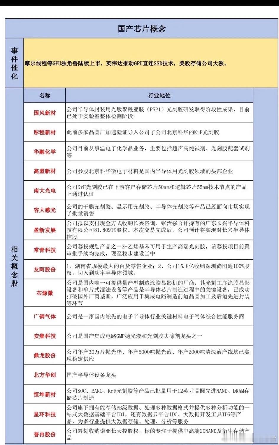 国产替代+芯片自主可控概念梳理突发!国产GPU与存储技术动态密集,芯片产业热度再起。 您提供的这张“国产芯片概念”表,在列出近20家公司的同时,揭露了一个比事件本身更深的信号:表格中超过12家公司的业务描述与“光刻胶”强相关,这恰恰点明了当前市场最大的预期差——当资金为“光刻胶国产替代”的故事集体亢奋时,产业真实且更确定的瓶颈,已悄然转向为光刻胶“配套”与“应用”的半导体设备及更上游的基础材料。反共识逻辑:市场惯性认为“卡脖子”在光刻胶本身,但产业真相是 “没有可靠的涂胶显影设备,再好的光刻胶也无法上产线;没有高纯试剂和抛光液,芯片制造就无法完成” 。因此,投资顺序应是:先设备与核心材料 → 再工艺耗材(如光刻胶) 。表中,芯源微(国内唯一可提供量产型涂胶显影设备)、北方华创(综合设备龙头)、安集科技(抛光液龙头)、鼎龙股份(抛光垫龙头)的逻辑,其实比众多仍处“实验室检测”、“验证导入”阶段的光刻胶公司更硬、更确定。独家拆解:三类公司的“兑现距离”根据表格中的业务描述,可按产业化进度分为三类,价值与风险迥异:1. 已实现国产替代的设备/材料龙头(高确定性): * 芯源微、北方华创、安集科技、鼎龙股份、广钢气体。它们的产品已“打破垄断”、“稳定供应”或成为“关键材料服务商”,是扩产刚需,订单能见度最高。2. 正处于验证突破期的光刻胶公司(高弹性,高风险): * 彤程新材(KrF验证导入)、南大光电(已通过50nm/55nm认证)、容大感光(已批量销售)。处于从“0到1”或“1到N”的关键阶段,行情由“通过客户认证”的具体公告驱动,需密切跟踪。3. 研发早期/间接参股公司(主题性): * 如国风新材(PSPI研发中)、高盟新材(参股科华)。代表未来可能性,但产业化道阻且长。核心认知差:此轮芯片投资的核心矛盾,是 “垂直突破”。与其泛泛投资“芯片概念”,不如聚焦 “在某个极小但关键的环节上,已打破垄断、实现稳定供货的隐形冠军” 。设备与基础材料公司的业绩,将随着整个中国芯片产能的扩张而稳步增长,波动性小于单一品类的耗材。给你的关键观察指标:告别“有光刻胶就炒”,应紧盯:1. 订单验证:对设备/材料龙头,关注其是否获得 “国内头部晶圆厂(如中芯国际、长存)的重复订单”。2. 认证进展:对光刻胶公司,搜索其公告是否明确获得 “某制程(如28nm)的批量生产认证”,而非仅“验证中”或“送样”。留给读者的问题:在芯片材料国产化的长征中,你认为当前更大的机会在于 “已实现突破、需求确定的设备及核心材料龙头”,还是 “正在突破、弹性巨大的光刻胶等专用材料公司”?评论区聊聊你的逻辑。(注:以上分析基于您上传的图表及公开信息,所提及公司仅为该表格举例,不构成任何投资建议。)今日看盘上证指数a股
