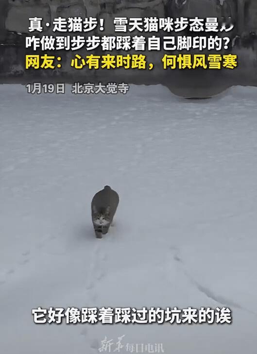“解释不清了!”北京大觉寺,一场大雪过后,一只小猫走进雪地中。它步态曼妙,就像一名时装表演的模特,最神奇的是,它每一步都精准地踩在原来留下的脚印中。 前几天北京下了一场大雪,在北京大觉寺内,有一只流浪猫,曼妙的步态让人印象深刻。最神奇的是它每一步都精准地踩在原来留下的脚印中。 这小猫太聪明了!查了一下资料才知道,猫的智商相当于2-3岁的儿童。小猫的这个举动,大概率藏着本能的智慧。雪地里的积雪又冷又深,对于体型小巧的猫咪来说,重新踩进自己留下的脚印里,既能避开深雪的阻碍,又能减少脚掌直接接触冰雪的寒冷,这是小动物适应环境的聪明办法。看着小猫曼妙的步态,真是温暖又治愈。 雪地里的小猫不懂什么大道理,但它用最本能、最可爱的行为,给我们上了生动的一课:顺应自然、珍惜过往、专注当下,就能在生活的“雪地”里,走出一条既稳妥又曼妙的道路。