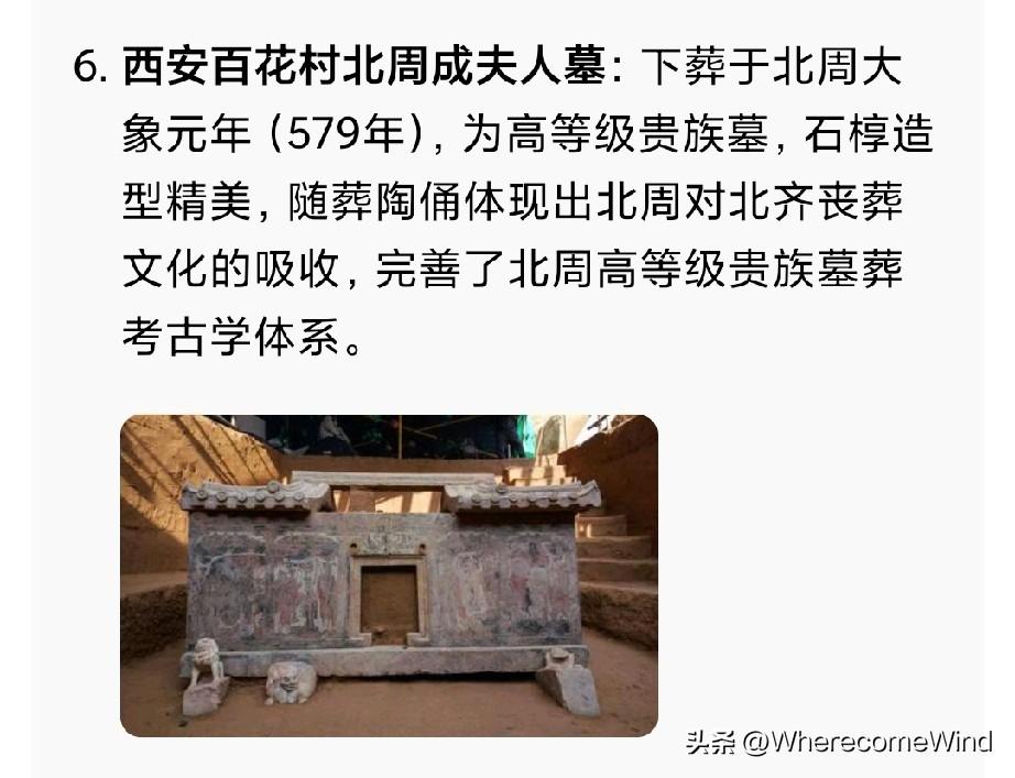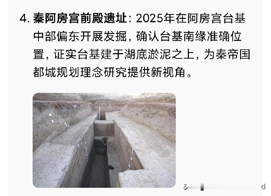 2026年1月16日陕西考古发布: “2025年度六大考古新发现”在西安揭晓 。 1. 渭南蒋家遗址 2. 咸阳淳化罗家河遗址 3. 宝鸡凤县梁鹿坪遗址 4. 秦阿房宫前殿遗址 5. 榆林靖边统万城遗址 6. 西安百花村北周成夫人墓 其中,西安两处。 秦阿房宫前殿遗址特别引人瞩目, 说明《阿房宫赋》并非空穴来潮。