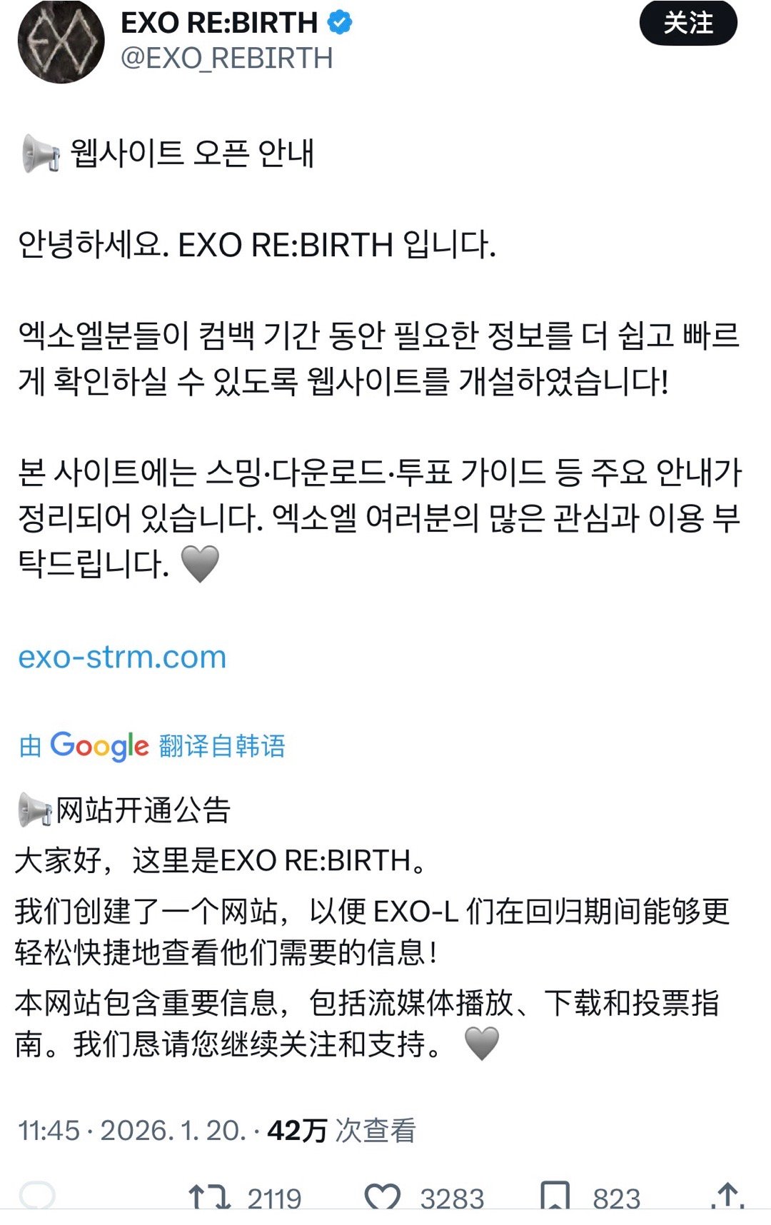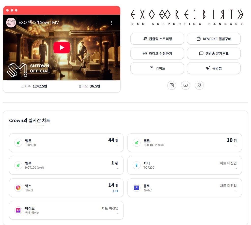 EXO粉丝为回归开设网站EXO粉丝太努力了对这次EXO回归是真心的EXO-L们为了纪念这次正规8辑回归,粉丝开设了流媒网站,不仅能确认实时榜单排名,买专辑、申请预录/电台、投票等各种回归相关内容都很齐全,爱丽们这把真的太努力了!🔗 网页链接