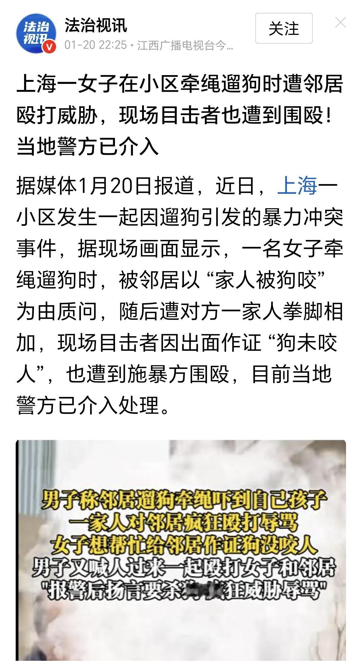 “过火了吧!”家人被狗咬了,心情可以理解,但不分青红皂白,看到牵狗的人就觉得找到主了,竟然连给对方作证的邻居都打了。 近日,上海一女子在小区内牵绳遛狗,没想到“飞来横祸”,被邻居一家人围殴,因为对方说她家的狗咬人了。 女子说她家的狗没咬人,但对方认定了就是她的狗把人咬了,任凭她说什么都不信。 旁边有位女邻居出来给该女子作证说她家的狗没咬人,结果这家人变本加厉,不但不听劝,而且还叫人来,把作证的这位女邻居也打了。 家人被狗咬了,心情可以理解,但也不能看到牵狗的人就要“算账”吧! 这家人凭什么那么自信就认定是该女子家的狗咬人了呢? 就没可能是自己看走了眼吗? 毕竟长得像的宠物狗也不少。 话说回来,就算是该女子家的狗确实咬人了,那也不能辱骂和围殴人家,可以报警解决问题呀! 把作证的女邻居也围殴了,就更是不可理喻了。 提到遛狗不牵绳这样的 不文明养狗行为,很多网友都十分气愤,但事情也不该走向反面,只要养狗了就有错,就可以无端被指责和诬赖? 都在一个小区里住着,抬头不见低头见,不管是养狗的还是不养狗的,只有相互理解和包容才能和谐相处。