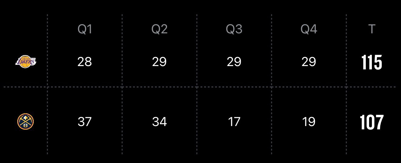 湖人这四节的得分稳的毫无波动,掘金就跟突然跳崖了一样。湖人