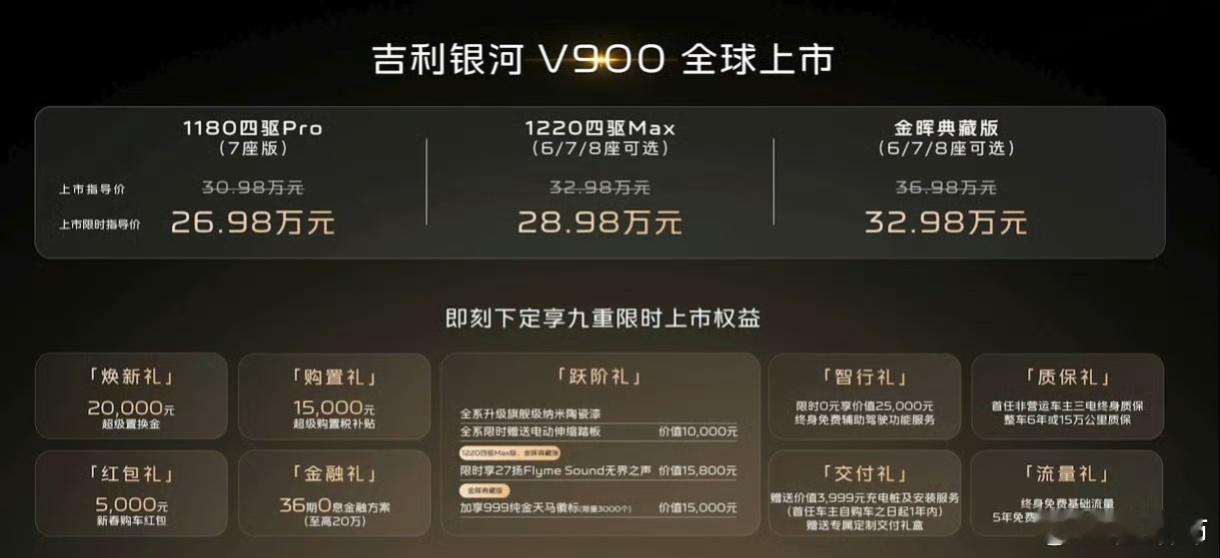 吉利银河V900上市了,30万不到可以买到一台空间巨兽,三排6/7座车型依然有很大的行李空间, 如果有想法还可以买四排8座的版本。同时这台车也标配了使用元戎启行算法的千里浩瀚H5,城区NOA能力跟它的空间一样好用话说元戎去年挺进取的,作为供应商1-10月的城区NOA装机量排在前二,接下来还会有更多惊喜,你猜猜下一台使用他们算法的新车会是谁呢?吉利银河v900全球上市26.98万起
