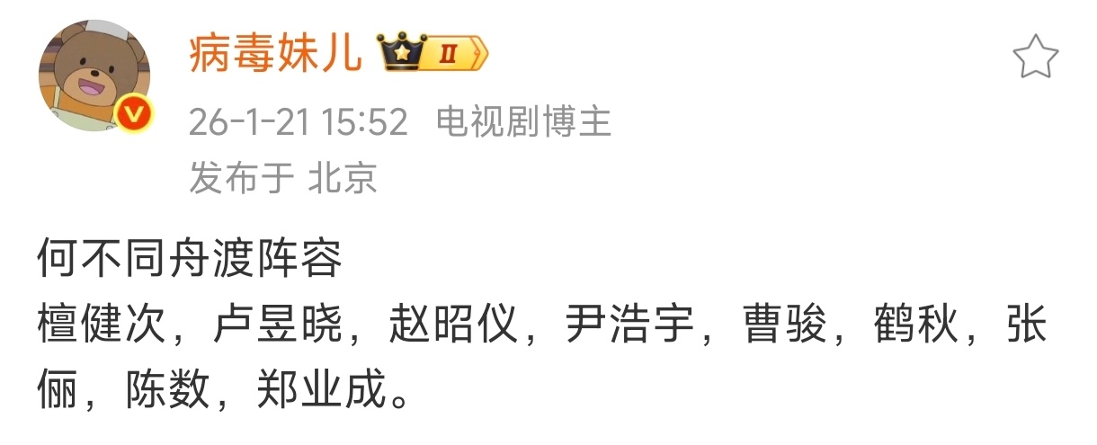檀健次卢昱晓何不同舟渡阵容檀健次,卢昱晓,赵昭仪,尹浩宇,曹骏,鹤秋,张俪,陈数,郑业成。 何不同舟渡网传阵容网传何不同舟渡阵容