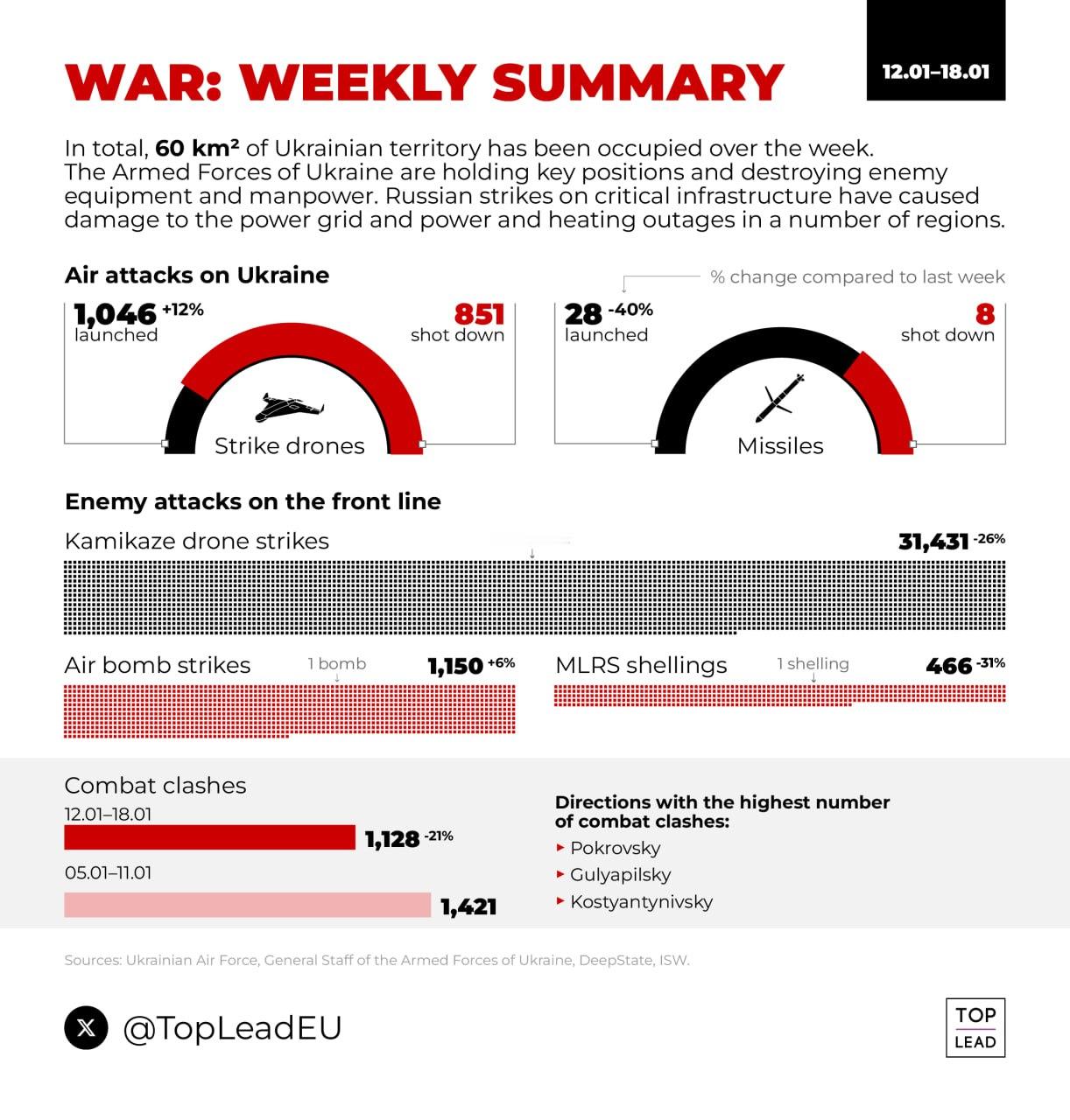 俄乌局势新进展 本周,乌克兰又丢了 60 平方公里领土。俄罗斯对关键基础设施的打击已造成电网受损,多个地区出现电力与供暖中断。对乌克兰的空中打击攻击无人机:发射 1046 架(较上周 + 12%),击落 851 架导弹:发射 28 枚(较上周 - 40%),击落 8 枚前线敌方攻击“神风” 无人机打击:FPV无人机 → 31431 次(-26%)航空炸弹打击:1150 次(+6%)多管火箭炮炮击: 466 次(-31%)战斗冲突最密集区域:波克罗夫斯基古利亚皮利斯基科斯坦丁尼夫斯基来源:乌克兰空军、乌克兰武装部队总参谋部、DeepState、ISW