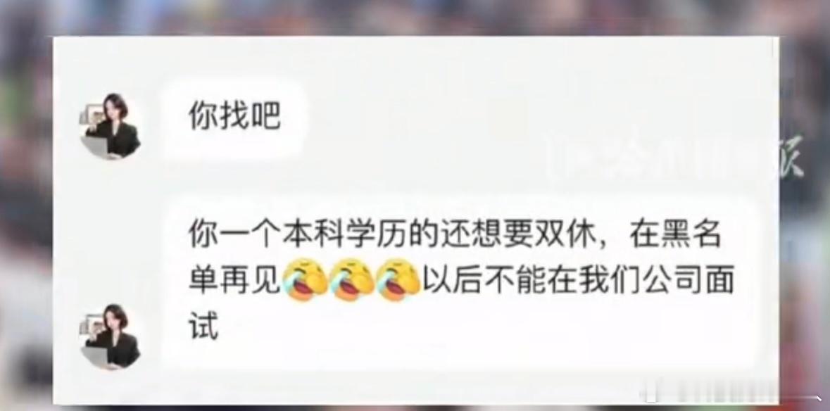 HR讽刺求职者本科学历不配双休什么霸道公司?揪出来避雷,一言不合直接拉黑名单,HR的学历不一定是本科,但是他们公司的本科一定没有双休,什么时候本科学历也低人三等了