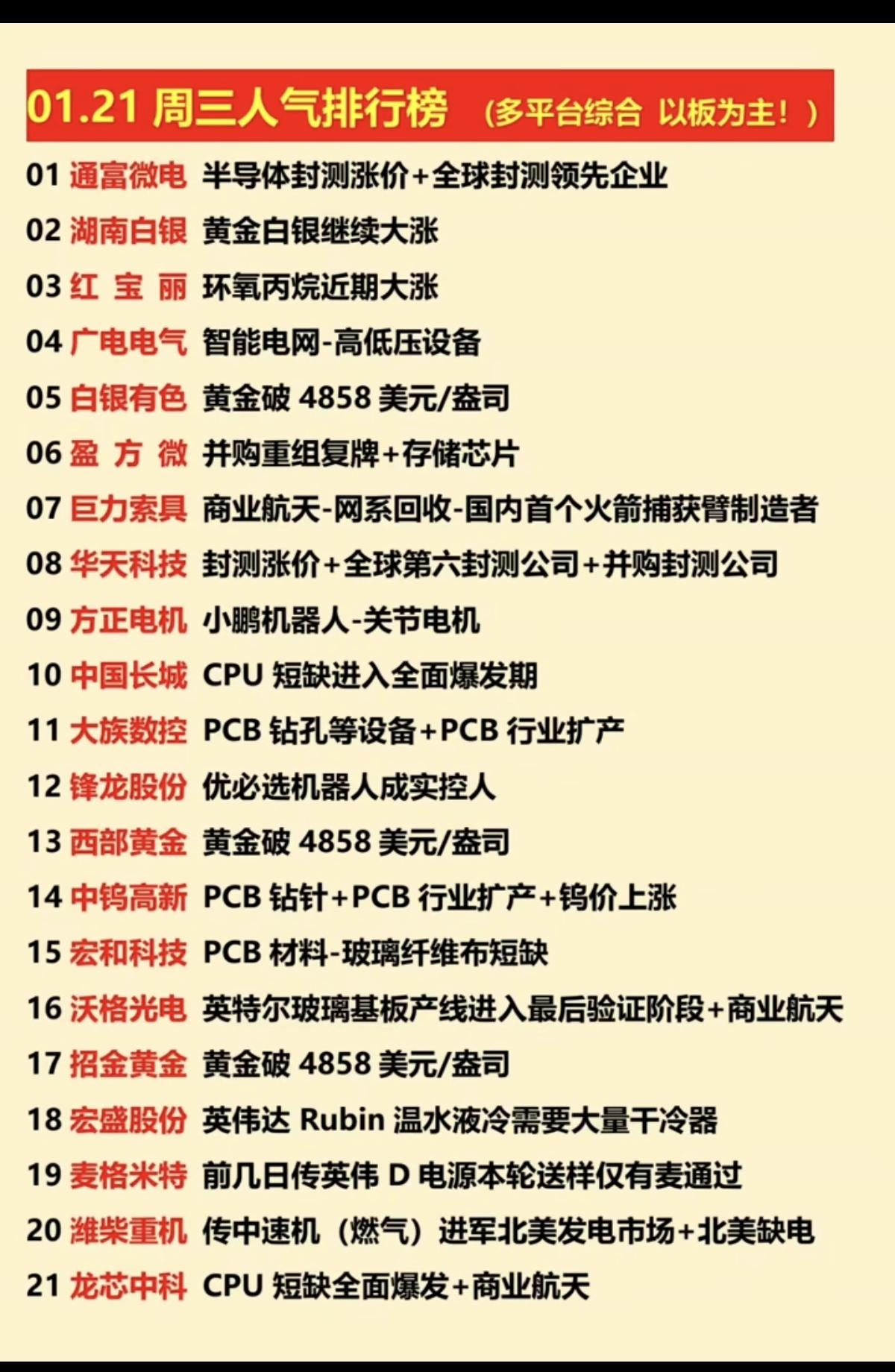 1.21周三 涨停板股票:人气龙虎榜! 1.先进封装+算力 2.黄金白银 3.存储芯片,PCB 4.智能电网 5.液冷服务器