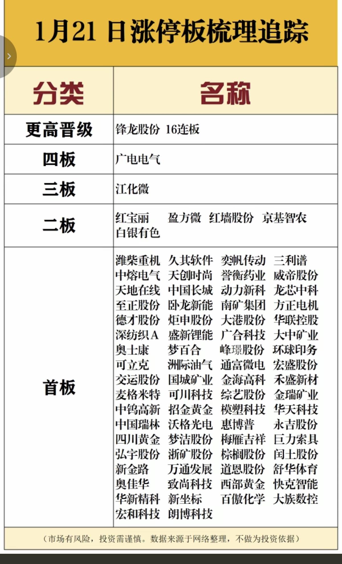 1.21周三 涨停板股票:复盘总结! 涨停板78家 跌停家数4家。 热点题材:电池+芯片+机器人, 涨跌比 2962上涨 2045下跌 16连板 锋龙股份 机器人 3连板 江化微 半导体
