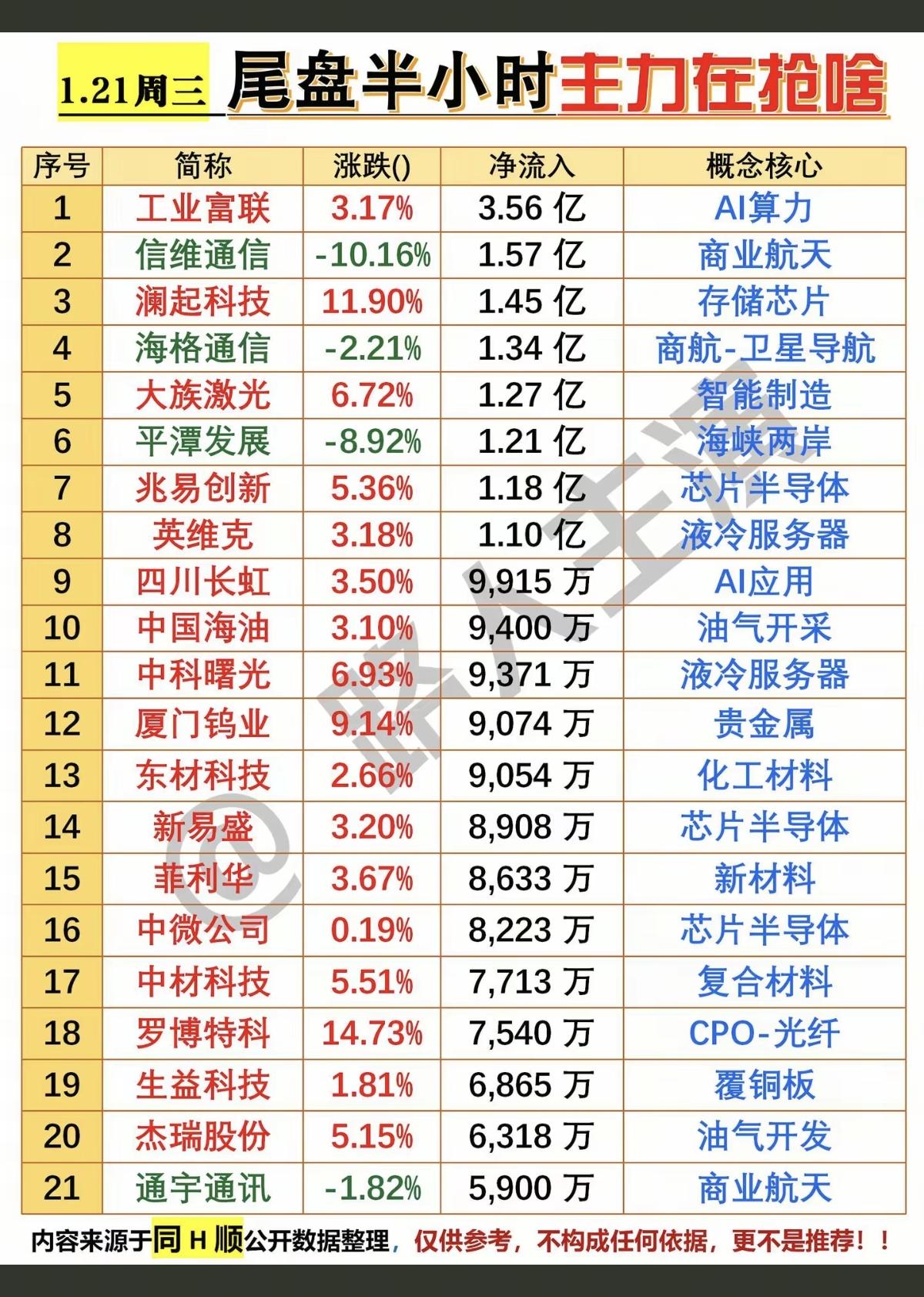 1.21周三 主力资金 尾盘抢筹 个股榜! 尾盘半小时抢筹,主力净流入 芯片半导体,油气开采,贵金属,化工原料,液冷服务器,新材料PCB,矿产资源等资金流入较多。