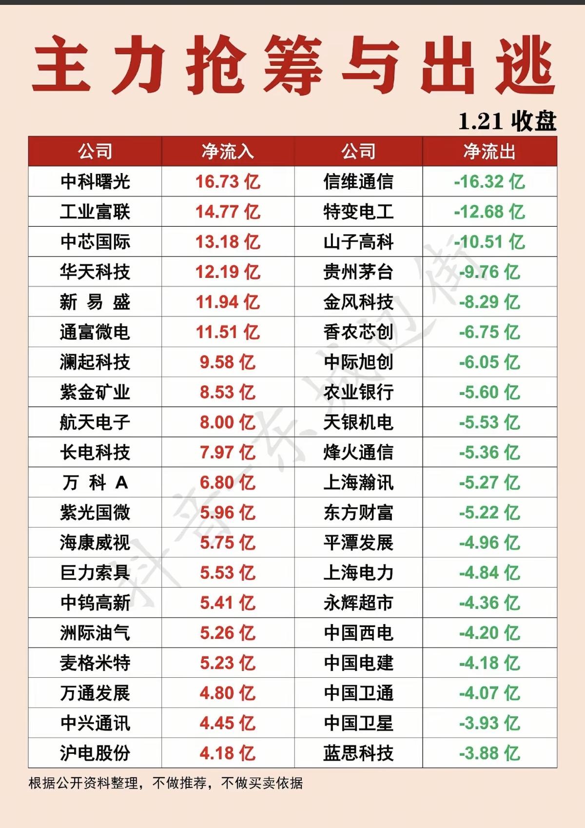 1.21周三 主力资金买入,抢筹个股榜! 资金抢筹、出逃方向: 光通信模块,钛白粉,有色金属,黄金白银,小金属,碳酸锂矿概念等资金抢筹明显 食品饮料,煤炭开采,社区团购,预制菜,煤化工,商业百货等板块资金疯狂出逃