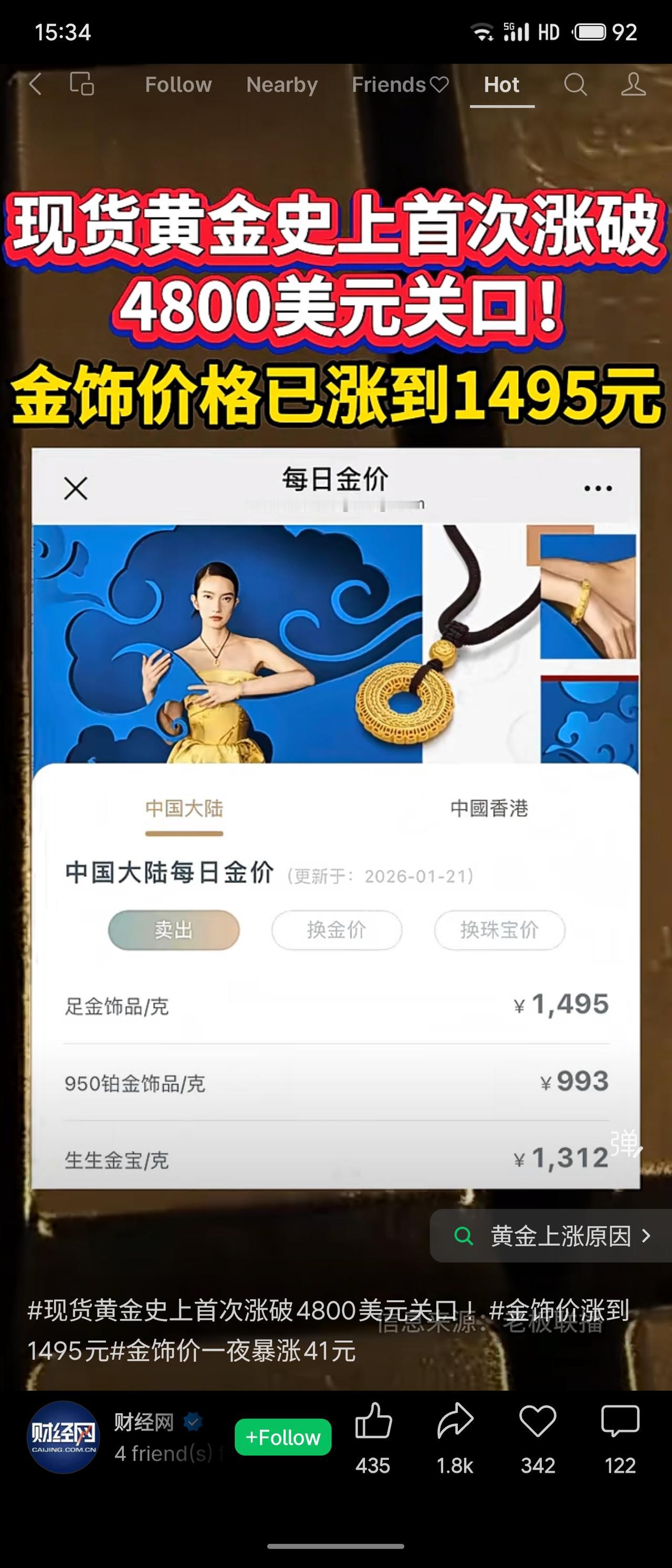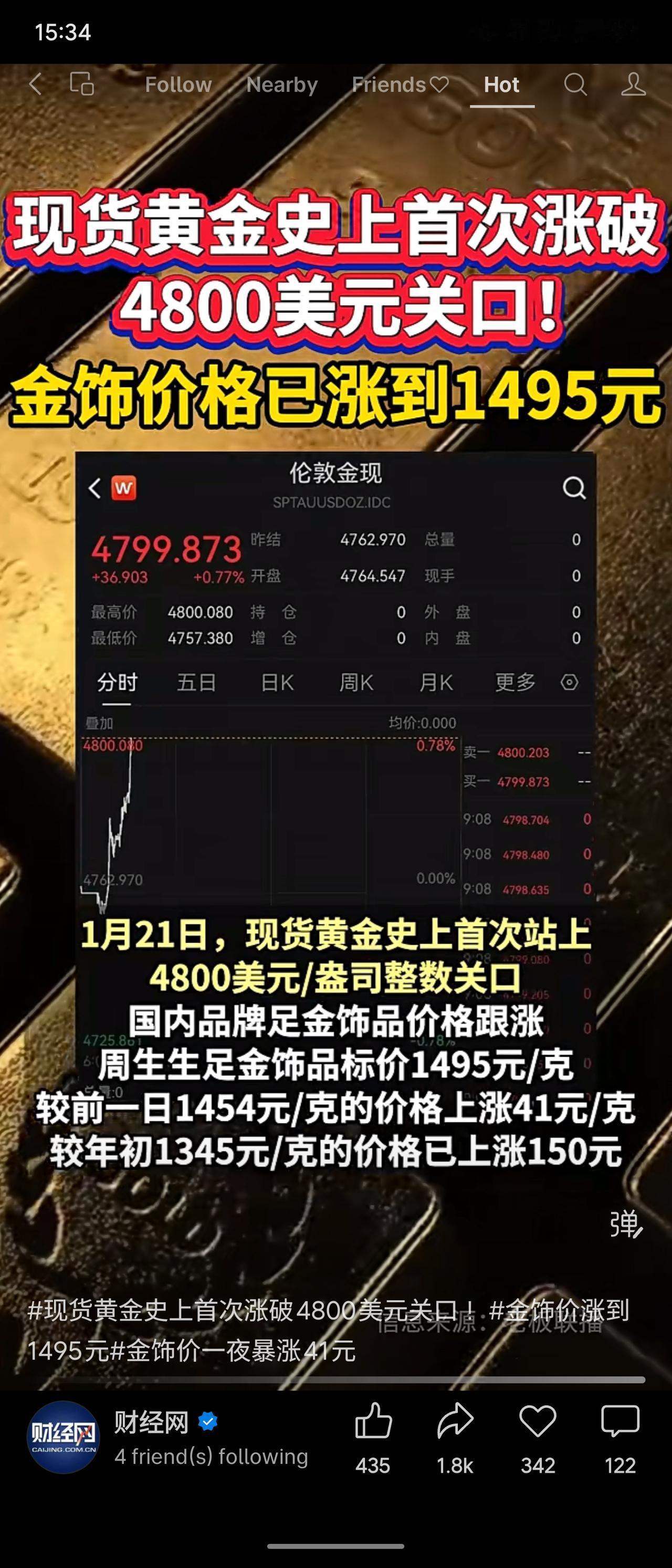 2026年1月21日,现货黄金价格首次突破每盎司4800美元大关。受此影响,国内品牌足金饰品零售价跟涨,如周生生当日标价已达每克1495元,单日上涨41元。