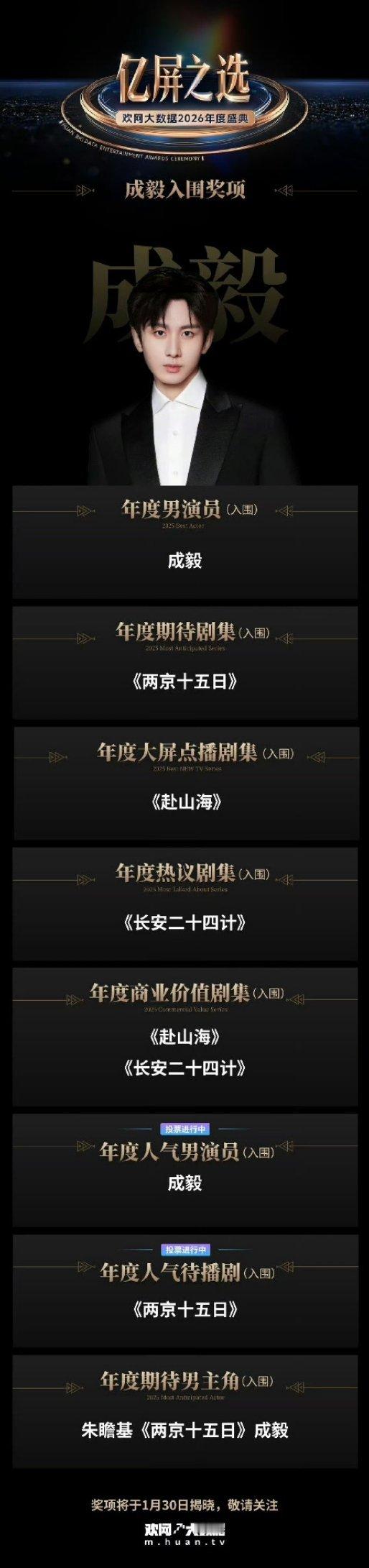 成毅获得欢网大数据9项提名,已播待播全都在