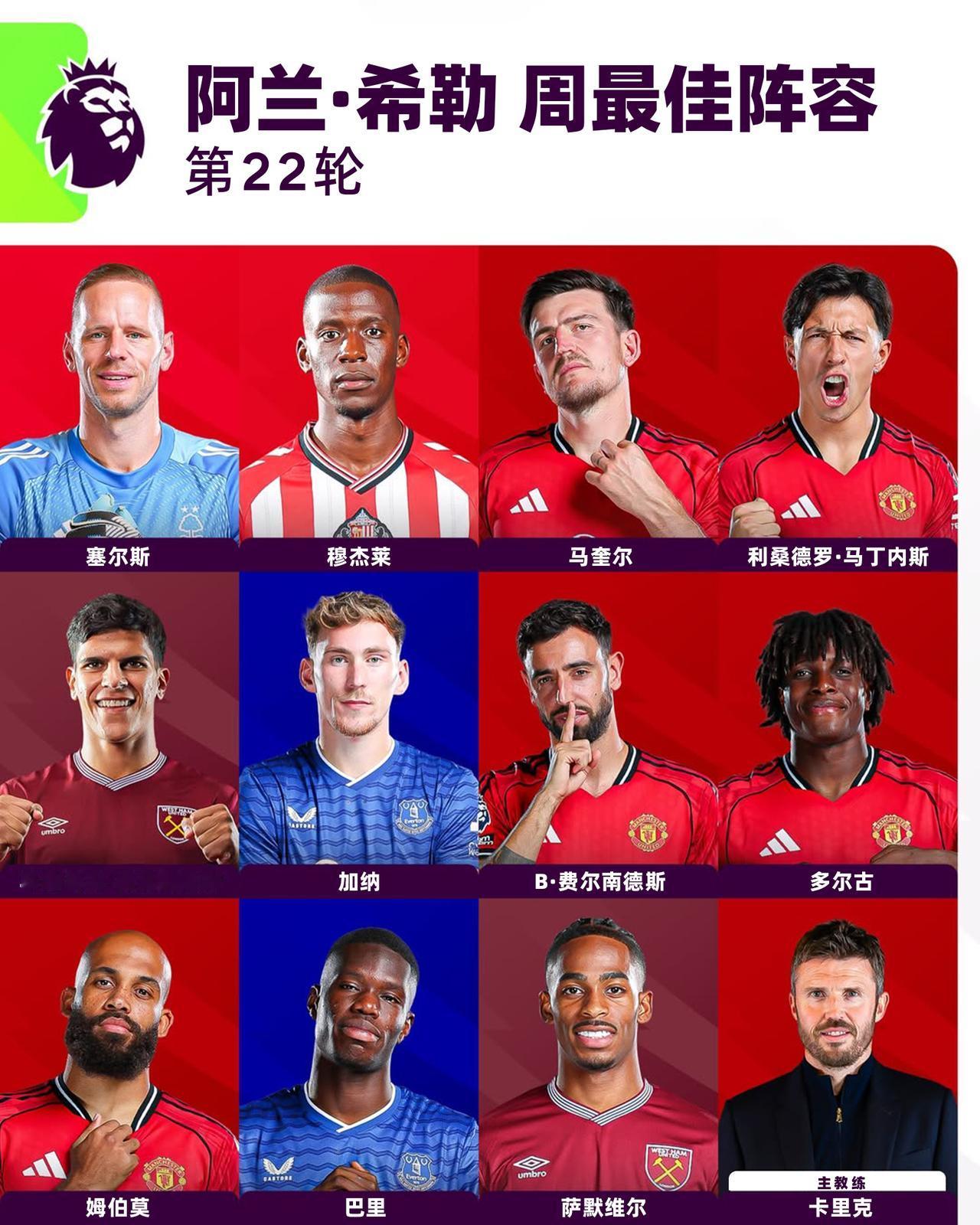 阿兰·希勒评选2025/26赛季英超第22轮最佳阵容 👔最佳主帅——卡里克 👕塞尔斯镇守大门,曼联5名球员入选
