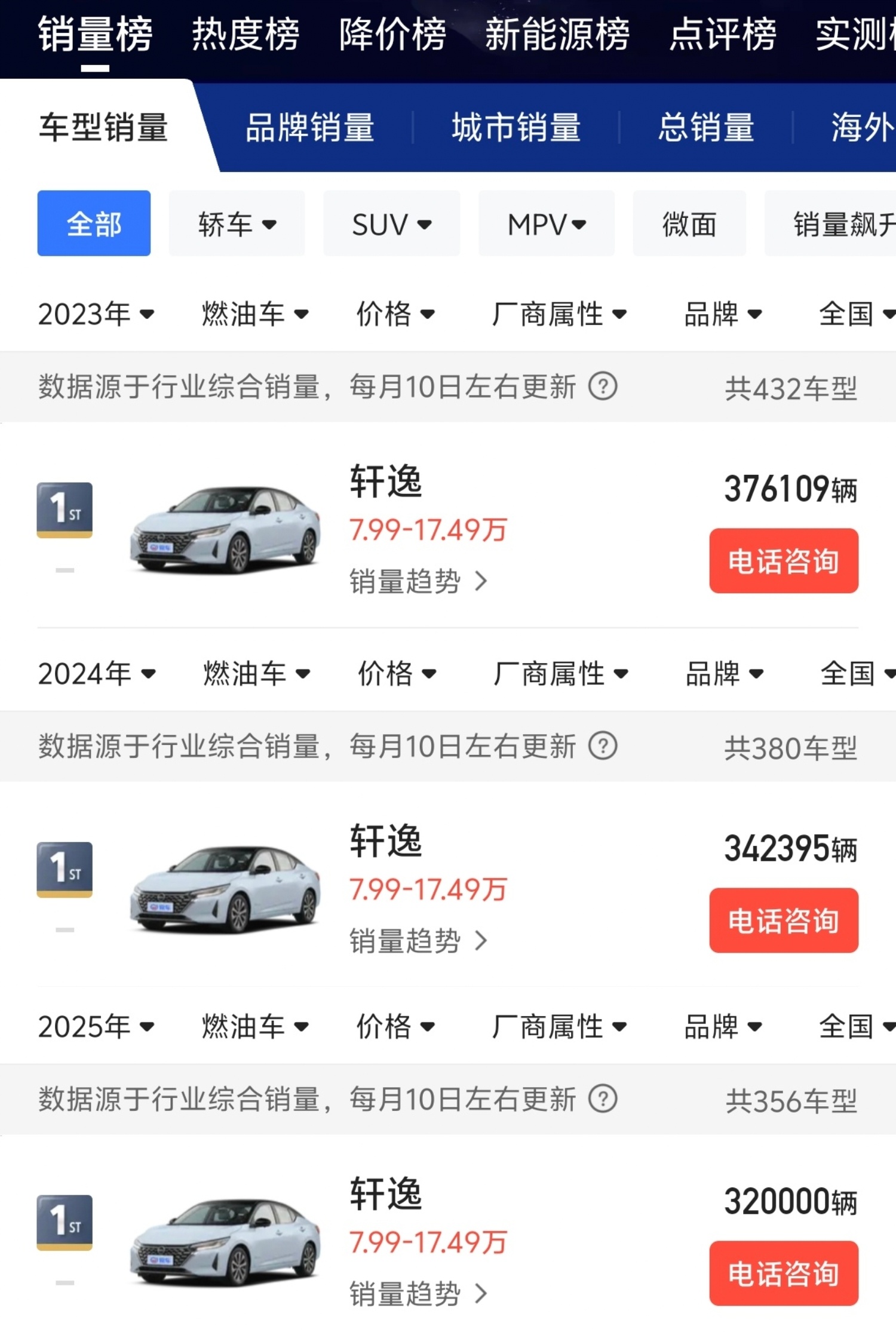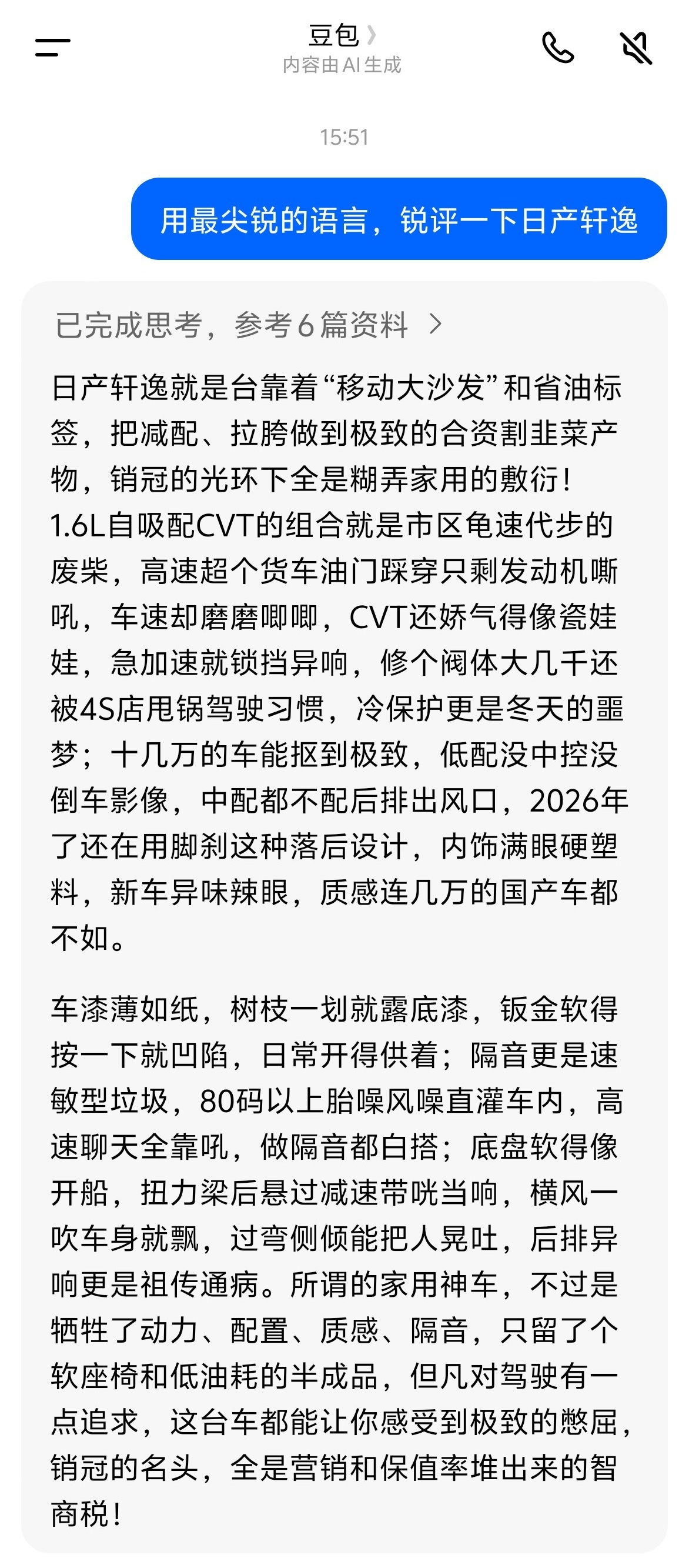 说到日产轩逸,很多人的第一印象可能是极致减配、动力弱鸡的“马路三大妈”之一。然而轩逸能在新能源冲击下,连续多年稳坐燃油车销冠的宝座,这就很有意思了轩逸做对的关键一点,就是精准地抓住了对一辆家用车最基础的需求——省油、省心、空间大。标配6气囊倒是挺良心,此外不影响开车的配置几乎没有,把代步工具的核心打磨到极致。轩逸能这么好卖,还有一个原因就是新老款同堂销售,消费者可以看菜吃饭。经典款主攻七八万甚至更低的入门市场,对于保守务实派而言确实性价比极高;新款贵一丢丢,至少不是十几年前的设计了,配置的选择余地更多,当然也依然可以选没有收音机的丐版。至于缺点,干脆让豆包来锐评吧说白了,轩逸的成功就在于,它深刻理解并极致满足了“买得起、用不坏、卖得掉”的底层需求,市场上沉默的大多数都是这么想的。不过未来的事情谁都说不定,大家觉得,轩逸会不会有那么一天,成为下一个飞度?