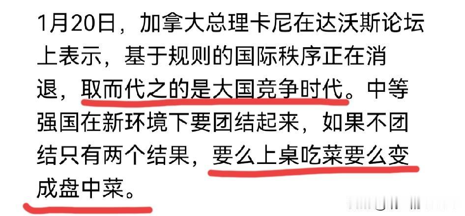 大国竞争时代来临。要么上桌吃菜要么变成盘中菜。加拿大总理卡尼,试图叫醒仍逃避现实的中等强国们…[捂脸] 1月20日,加拿大总理卡尼在达沃斯论坛上表示,基于规则的国际秩序正在消退,取而代之的是大国竞争时代。中等强国在新环境下要团结起来,如果不团结只有两个结果,要么上桌吃菜要么变成盘中菜。 经过特朗普几轮刺激,卡尼对现在的国际局势已经看得很清晰了。但并不是所有中等强国都清醒了,一些还对美国抱有幻想,幻想着美国换个人后再带领他们主导世界规则…[大笑][大笑][大笑] 朋友们,你们对此事怎么看? 欢迎大家在评论区探讨,留言…[送心]