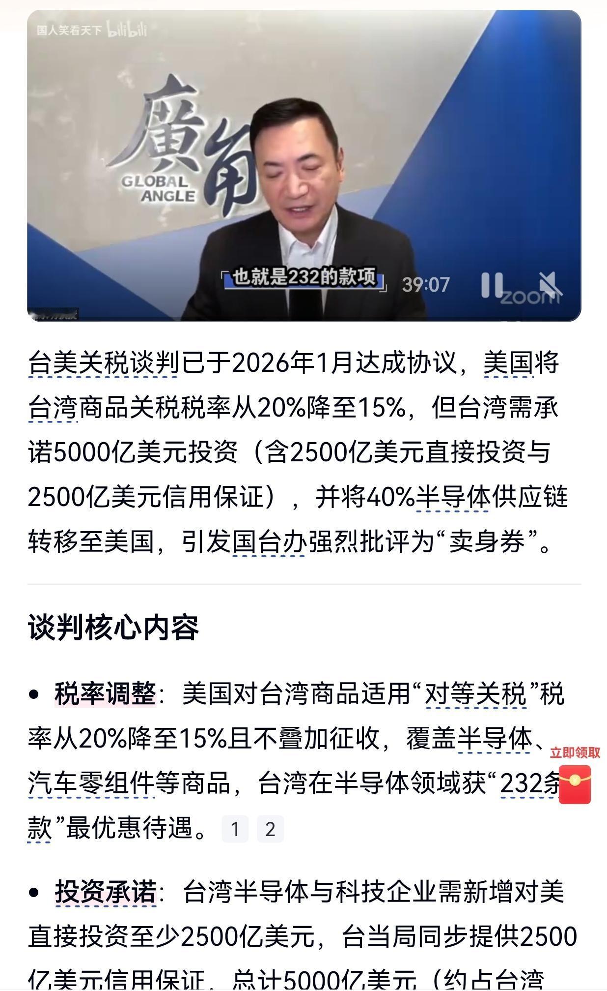 毫无疑问:乘此机会实现两岸统一,对两岸都是好事!这是“天时”,“地利”本来就是现成的,就缺个两岸的“人和”。实现统一后,不仅这次谈判的5000亿美元投资额都可以留在台湾自我发展用,就连以前每年向美国购买武器的那些钱也不用花了。