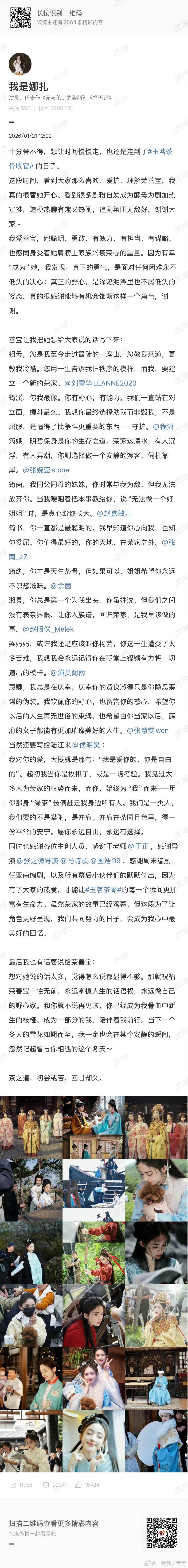 娜扎长文告别玉茗茶骨 娜扎发千字小作文告别荣善宝,付出了真感情的到结束时定是不舍,不过好在用心诠释的角色也在影片记录着,期待娜扎下一个角色!!