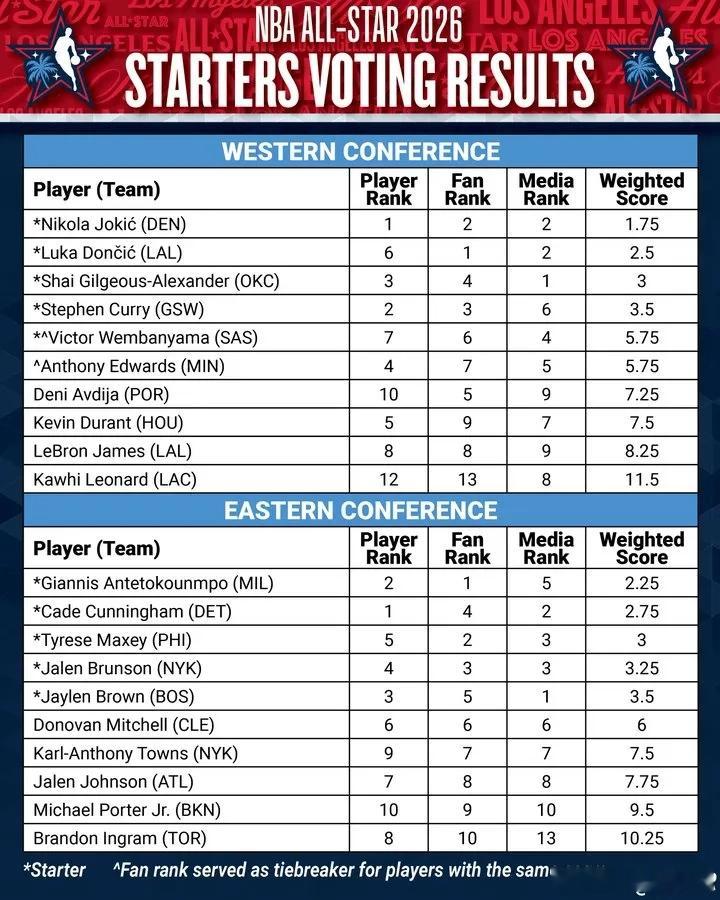 北京时间1月20日,NBA官方公布了2026年全明星赛的首发阵容。西部首发是亚历山大、约基奇、东契奇、文班亚马和库里,东部首发是字母哥、坎宁安、布伦森、马克西和杰伦-布朗。随后,NBA官方公布了具体票数。东契奇得到3402967票,成为票王(但加入媒体和球员票,加权最高是约基奇)。文班亚马和爱德华兹的加权积分相同(同为5.75),文班靠球迷票优势险胜(仅多出4505票),进入首发。2026年NBA全明星赛首发球员由球迷、现役NBA球员以及媒体评审团共同选出。球迷投票占首发人选评选权重的50%,球员与媒体投票各占25%。所有投票统计完毕后,球员将按照投票群体划分,在东西部两个联盟内分别进行排名。每位球员的最终得分,由其在球迷投票、球员投票和媒体投票中的加权排名取平均值计算得出。球员得分的权重分配为球迷投票占50%、球员投票占25%、媒体投票占25%,具体计算公式为:(球迷排名×2+球员排名+媒体排名)÷4东西部联盟中得分前五的球员将当选全明星首发。若同一联盟内出现球员得分相同的情况,球迷投票结果将作为最终的平分决胜依据。圣安东尼奥马刺队的文班亚马正是凭借这一规则,在与森林狼队球员爱德华兹的西部首发席位之争中胜出。