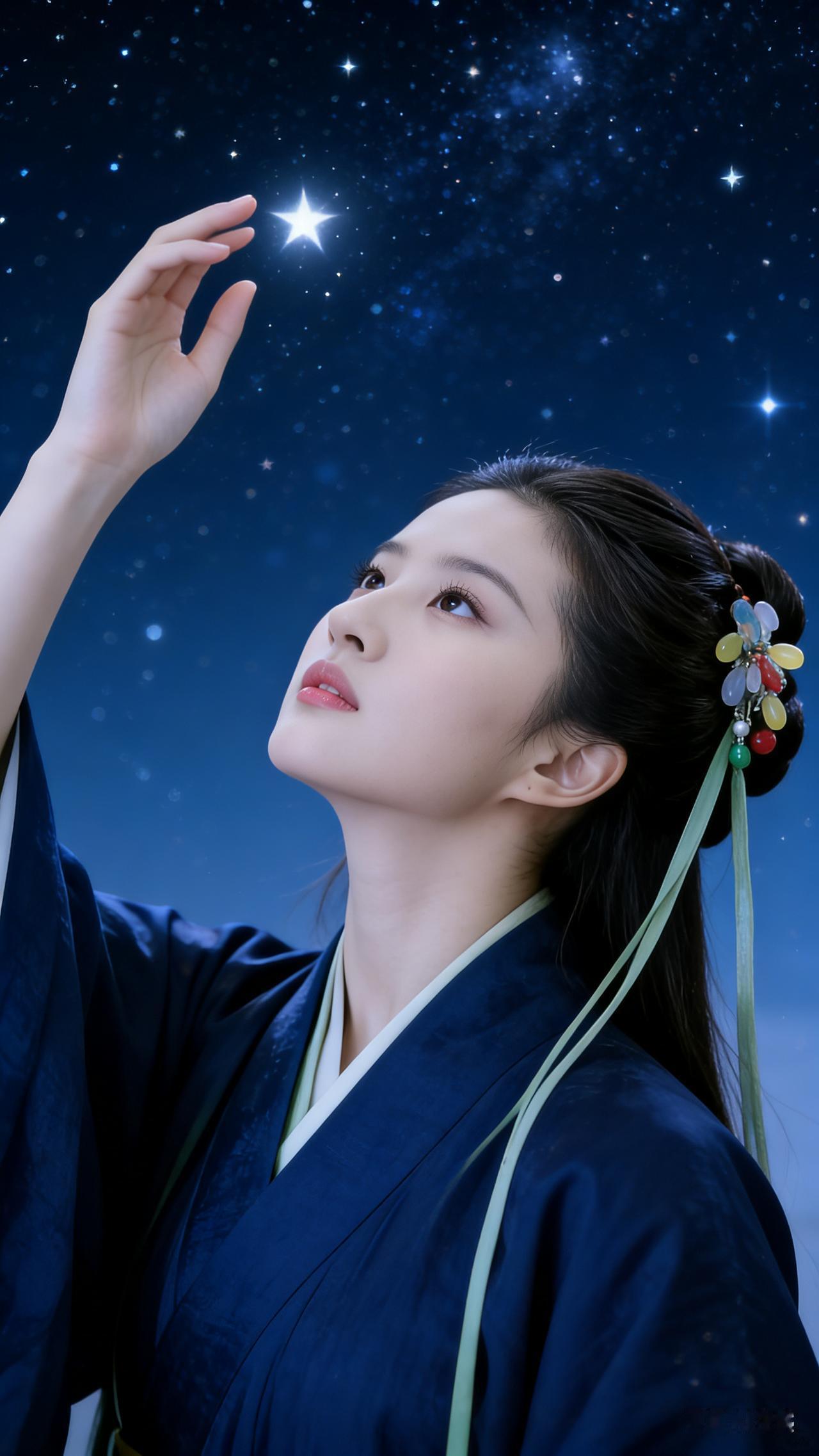 我以袖拢住半片夜色 指尖轻叩星子的门 它便燃成一小团火焰 落在我舒展的掌纹里 发间的彩饰是人间的虹 发带垂着晚风的信 而我仰起脸的弧度 是银河最软的折痕 不必问星子来自哪片星云 此刻它正顺着我的目光 落进眼底,成为 我私藏的黎明 刘亦菲亦 女神