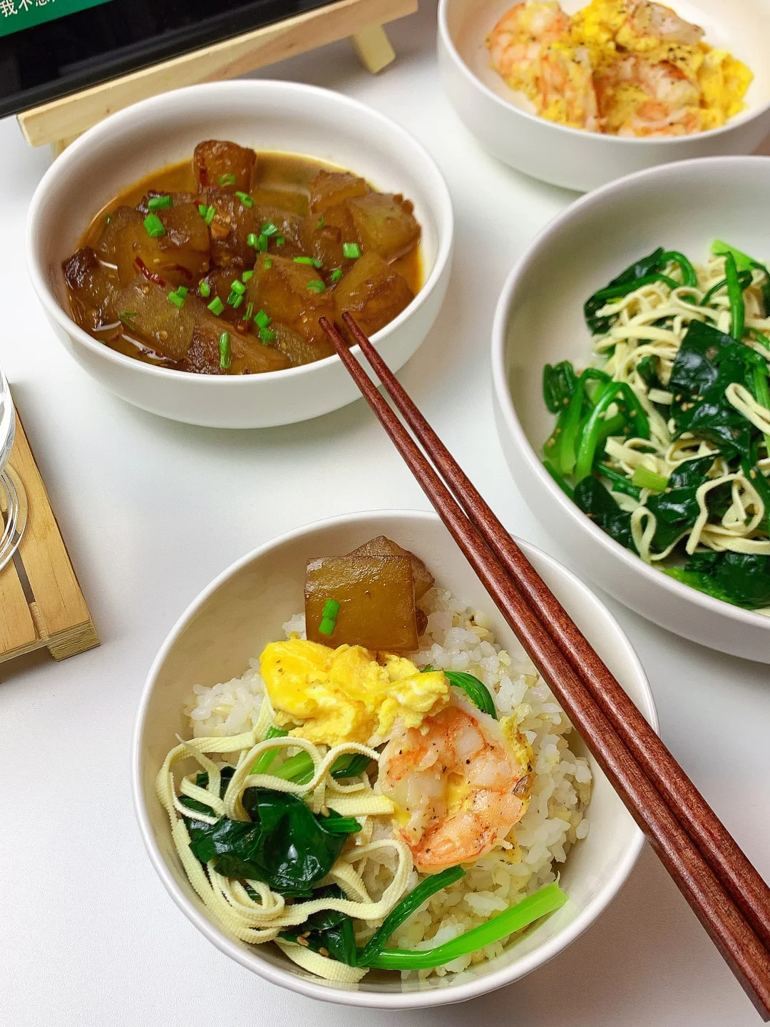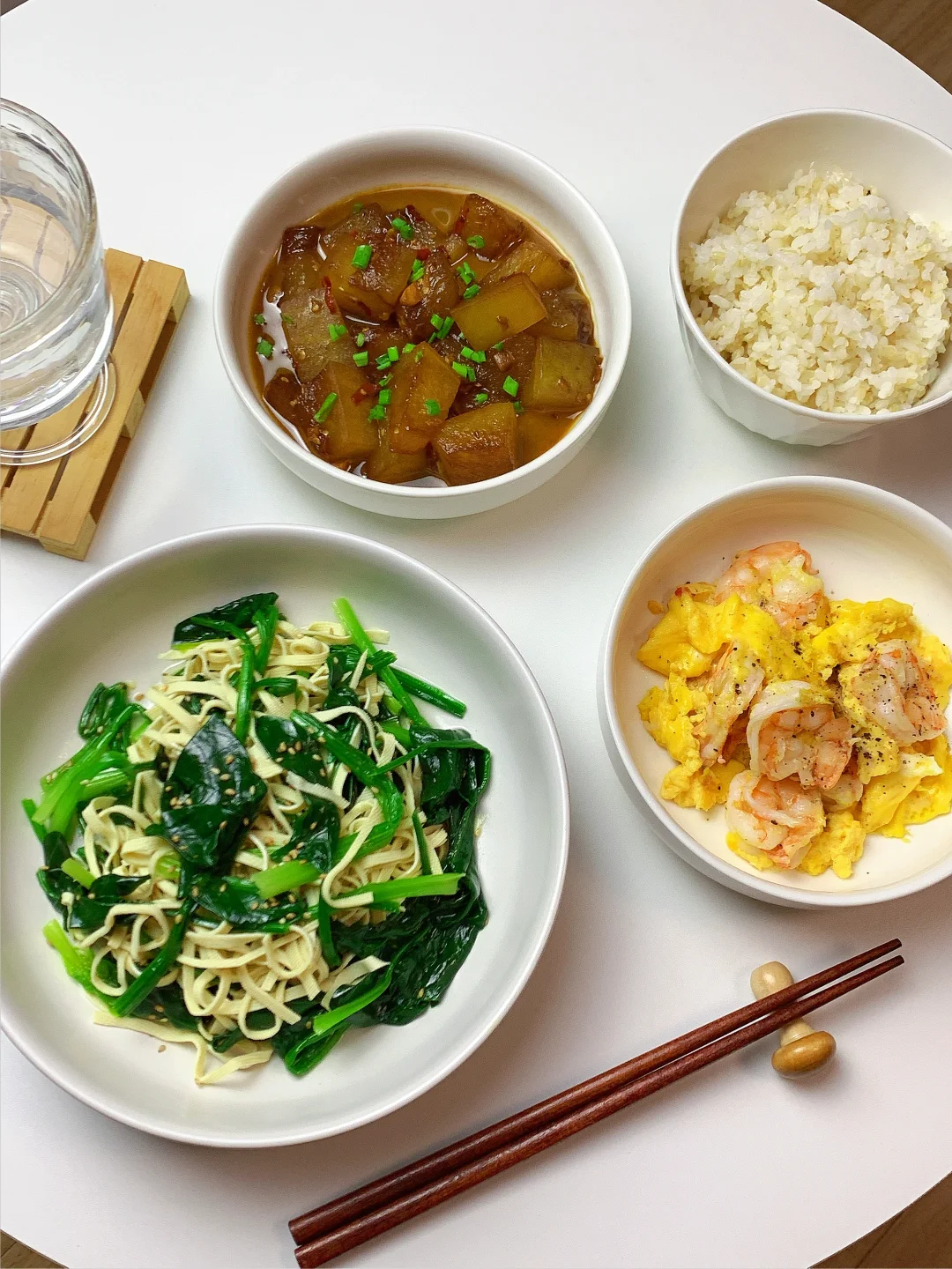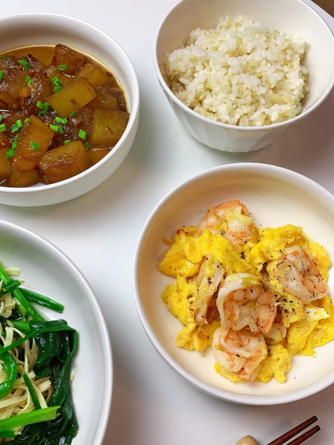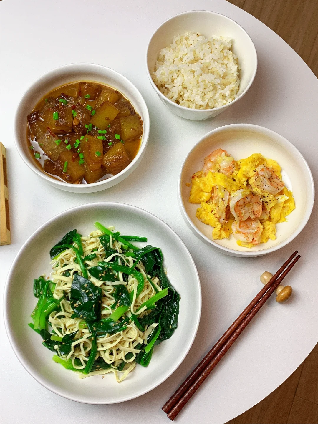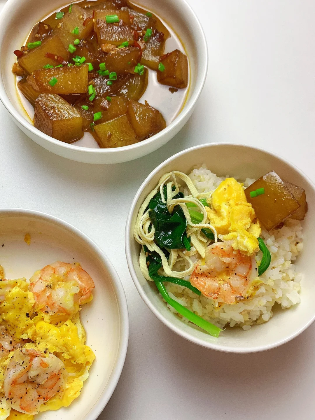 👩🏻🍳分享今日菜单 [一R]虾仁滑蛋 [二R]红烧冬瓜 [三R]菠菜拌豆腐丝 主食:米饭🍚 ……………………………………………………………………………… 🛒食材清单: 鸡蛋 | 虾仁🦐 | 菠菜 | 豆皮 | 冬瓜 ✨✨ 📝我的美食日记,一日三餐,拒绝外卖[偷笑R],坚持做饭的每一天,吃简单干净的饭菜~ ₍˄·͈༝·͈˄*₎◞ ̑̑
