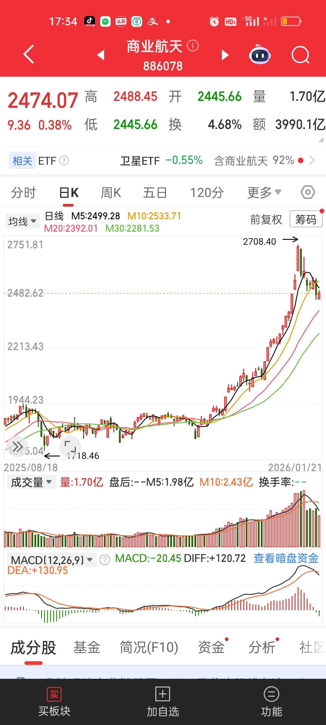 商业航天明天还是需要考验一下20日线,20日线这道支撑非常重要。不管是板块还是卫星ETF。板块今天收在2474.07, 20日线2392.01,2392.01/2474.07=0.9668,只有3.32%的下跌空间,而且明天20日线还会上移,实际空间可能2.5%都不到。 卫星ETF今天收盘收在1.873,20日线1.806,1.806/1.873=0.9642,还需要跌3.58%,大体和板块的下跌空间相当。20日线能撑住就还可以做。撑不住,要果断离场,最起码1个月不能靠近。
