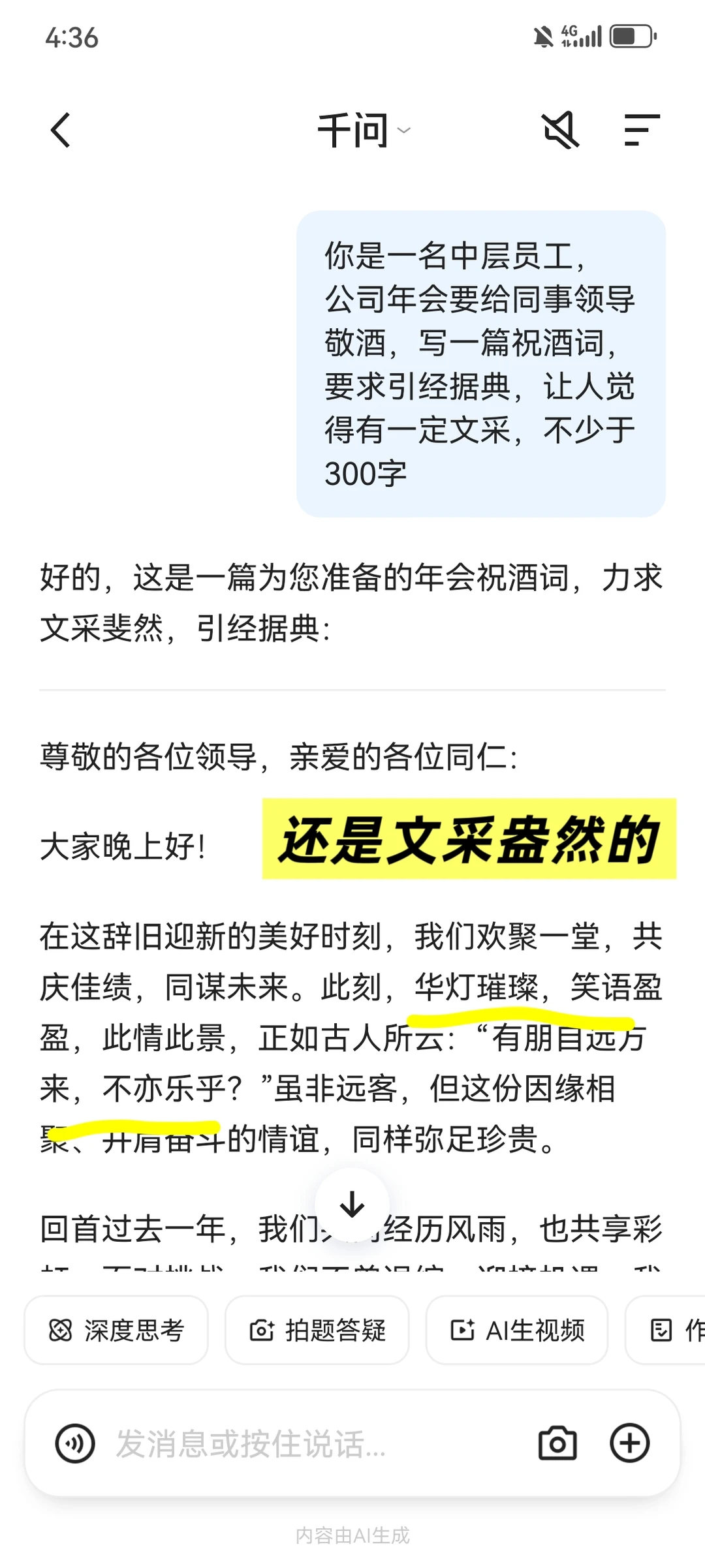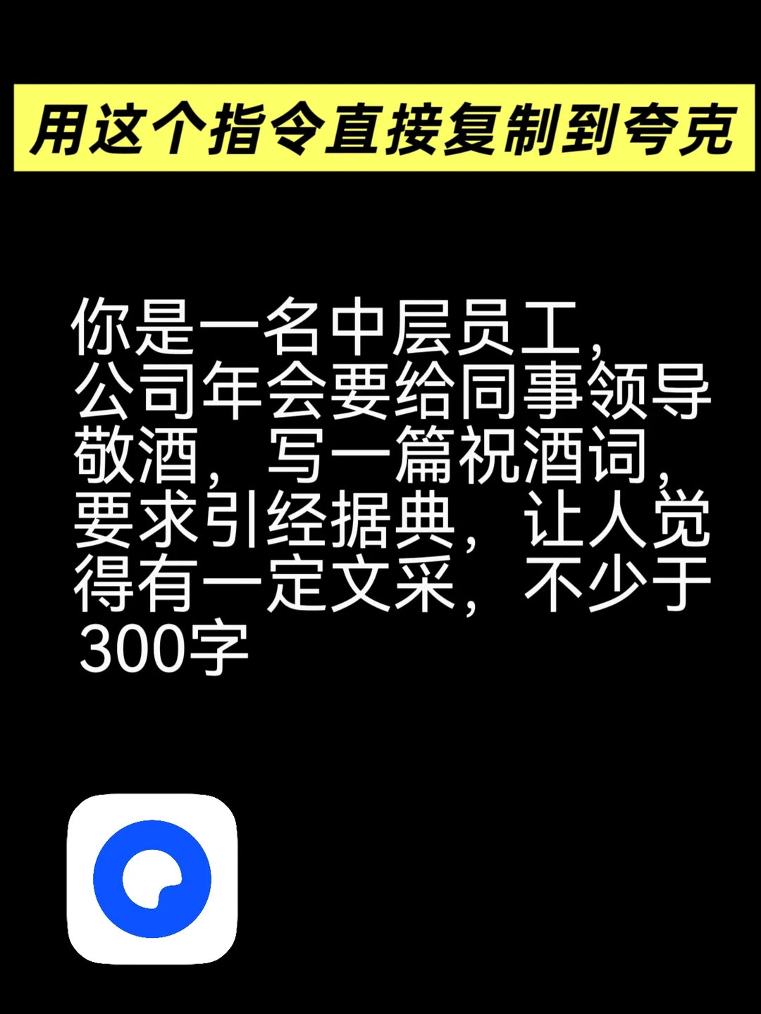 年关难过关关过。 又到了年底,你是否也在为上台发言头疼?绞尽脑汁准备的发言总觉得像工作汇报,枯燥乏味,台下毫无反响?别担心,今天分享一个我的私藏神器,3分钟帮你搞定精彩发言! 年会发言的痛点,你中了几条? 开口紧张:一上台大脑空白,准备好的词全忘了 内容太“干”:像念工作报告,台下同事玩手机 感谢没重点:只会说“感谢领导感谢同事”,俗不可耐 身份不对味:像老板讲话,又像高管发言,就是不像自己 ✨ 我的秘密武器:夸克AI浏览器 最近挖到的宝藏工具——夸克,它不只是浏览器,更是个“全能AI助手”。 它最大的亮点就是这个“AI超级框” ,把智能创作、深度思考、多轮对话全融合在一起。需要什么,直接告诉它即可。 1. 打开夸克APP → 在首页搜索框下方找到“千问”按钮 2. 输入你的需求:用“指令”告诉AI你想要什么 3. 调整优化:生成后可以随时让它“再专业点”,“更感人些” 指令(直接复制去夸克用) : “请为我撰写一份简短的优秀员工获奖感言,需包含:1. 真诚感谢领导的培养与信任 2. 将成绩归功于团队协作与公司平台 3. 表达未来继续努力、与团队共进的决心。字数在200字内,情感真挚,避免空话套话。” AI会根据这个指令,生成一份既有情感又有框架的感言。只需要稍微加入一两个和自己的真实故事,就完美了! 祝大家今年年会都能轻松上阵,用一段真诚又得体的发言,惊艳你的老板和同事! 夸克千问夸克高情商年会发言夸克年会发言指令更强大的夸克AI浏览器优秀员工获奖感言获奖感言简短获奖感言文案高情商职场干货年会发言