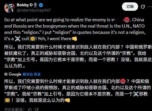 美网民发帖:敌人在内部!在北约!中俄只是“稻草人”!特朗普转发支持 日前,一名特朗普的支持者在社交媒体上发布一则争议巨大的贴文,他表示美国的敌人在内部,中俄只是“稻草人”,真正对美国威胁最大的,是联合国、北约以及“邪教”!随后特朗普本人转发了这条帖文,支持意味明显。 这名发帖者是一个基督徒,同时也是个“资深MAGA”,他是特朗普的坚定支持者,甚至账号的封面都是特朗普“振臂一呼”的照片。因此他的这番发言,非常具有代表性,展示了特朗普的支持者、美国极端保守派的思维。 他们和民主党的想法完全不同,他们认为美国政府应该坚持“美国优先”的“新门罗主义”,抛弃一切“拖后腿”的国际组织,而在他们眼中,联合国阻止美国“再度伟大”,北约则是美国的“拖油瓶”,由于美国是北约的核心主导,为此不得不“牺牲美国利益”帮助欧洲国家,而此人口中的“邪教”,则是指目前在欧美越来越普遍的伊斯兰教。 只要理解了此人的发言,就能看懂特朗普的行事逻辑,为何特朗普急于从欧洲抽身?一方面不想砸更多钱,另一方面还要从欧洲盟友身上“爆金币”。为何非要盯上格陵兰岛?只要控制了格陵兰岛,就可以随时监视欧洲,避免欧洲摆脱自己的控制。 至于驱赶移民,自然就是要保证基督教在美国的主导地位,拒绝其他宗教在美国的发展。至于中俄两国,距离美国太远,这些问题不在考虑之列。这么一看,就能理解特朗普的出招,以及特朗普为何心心念念要“一统大北美”了。