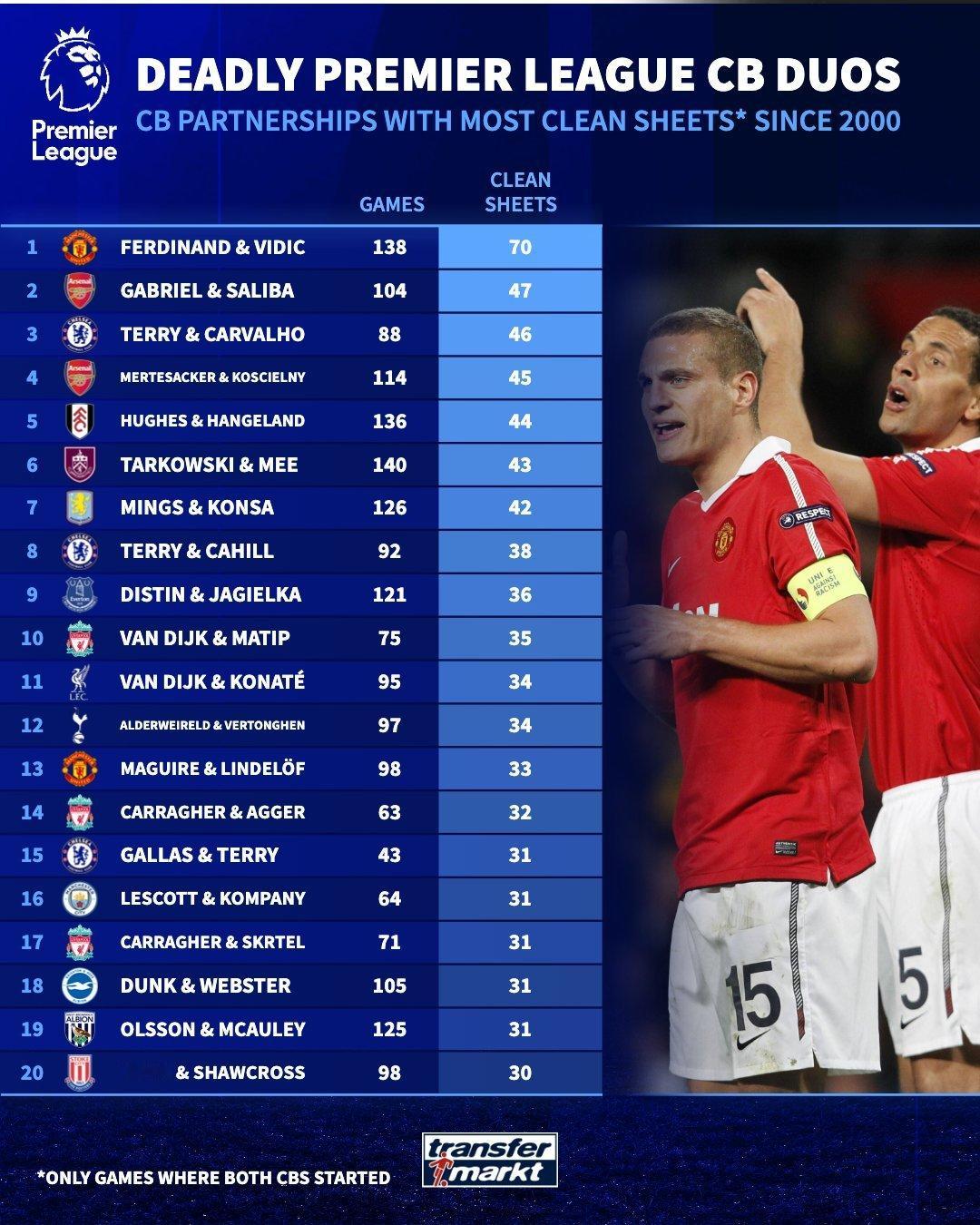属于费迪南德和维迪奇的恐怖数据昨天,Transfer Markt发布了一个英超中卫组合的数据统计:在费迪南德和维迪奇同时首发的138场英超联赛中,球队在70场比赛中拿到零封。这当然有范德萨的功劳,曼联强大的攻击线也会让后卫的防守压力小一些,但这份数据的含金量还是相当高的。※ 这个榜单只统计2000年之后的数据仔细看的话,大家也能榜单中找到其他亮点,比如:- 排在第二的是阿森纳目前的中卫组合,考虑到现在英超的水平和难度,其实人家的数据含金量很足- 仔细看特里,他和三位不同球员组成的中卫组合在榜单中出现了3次truered