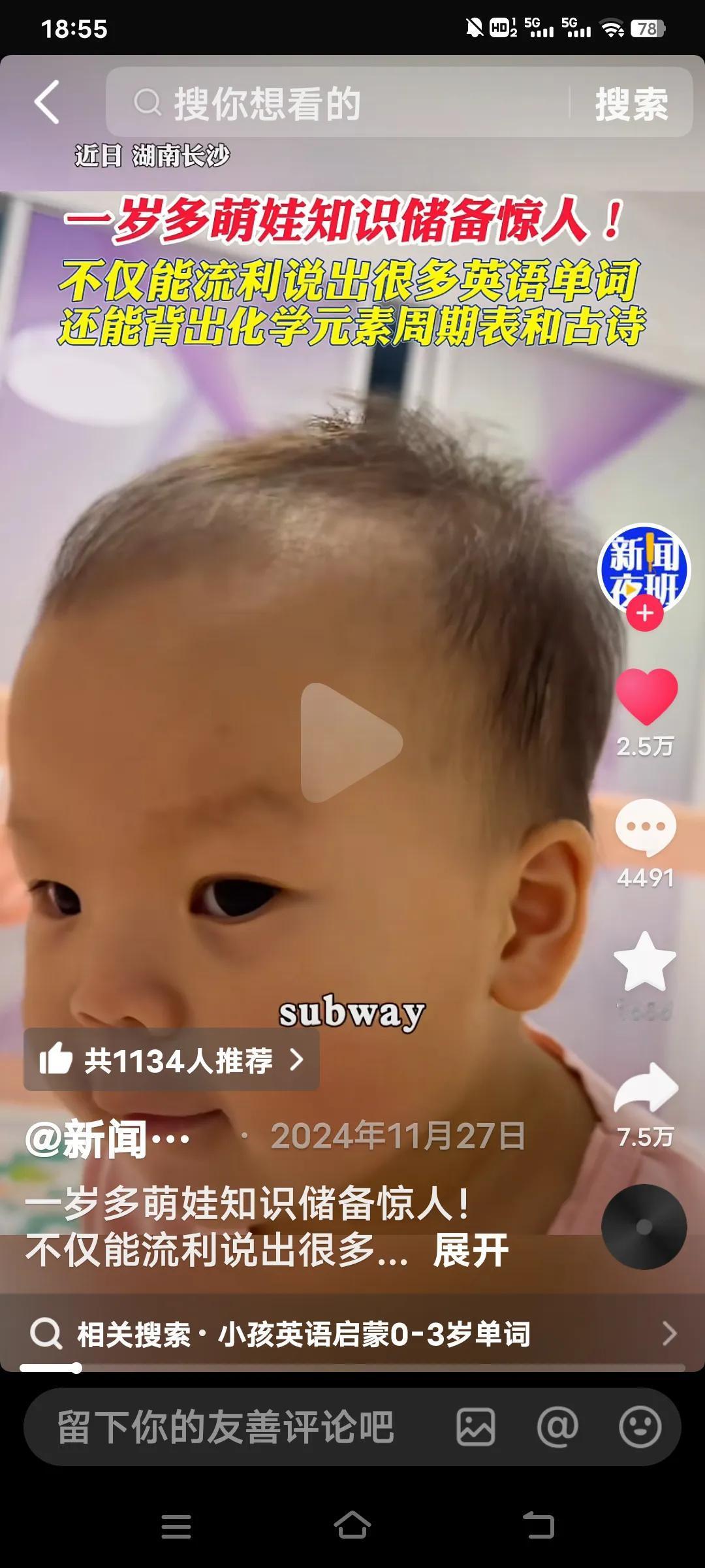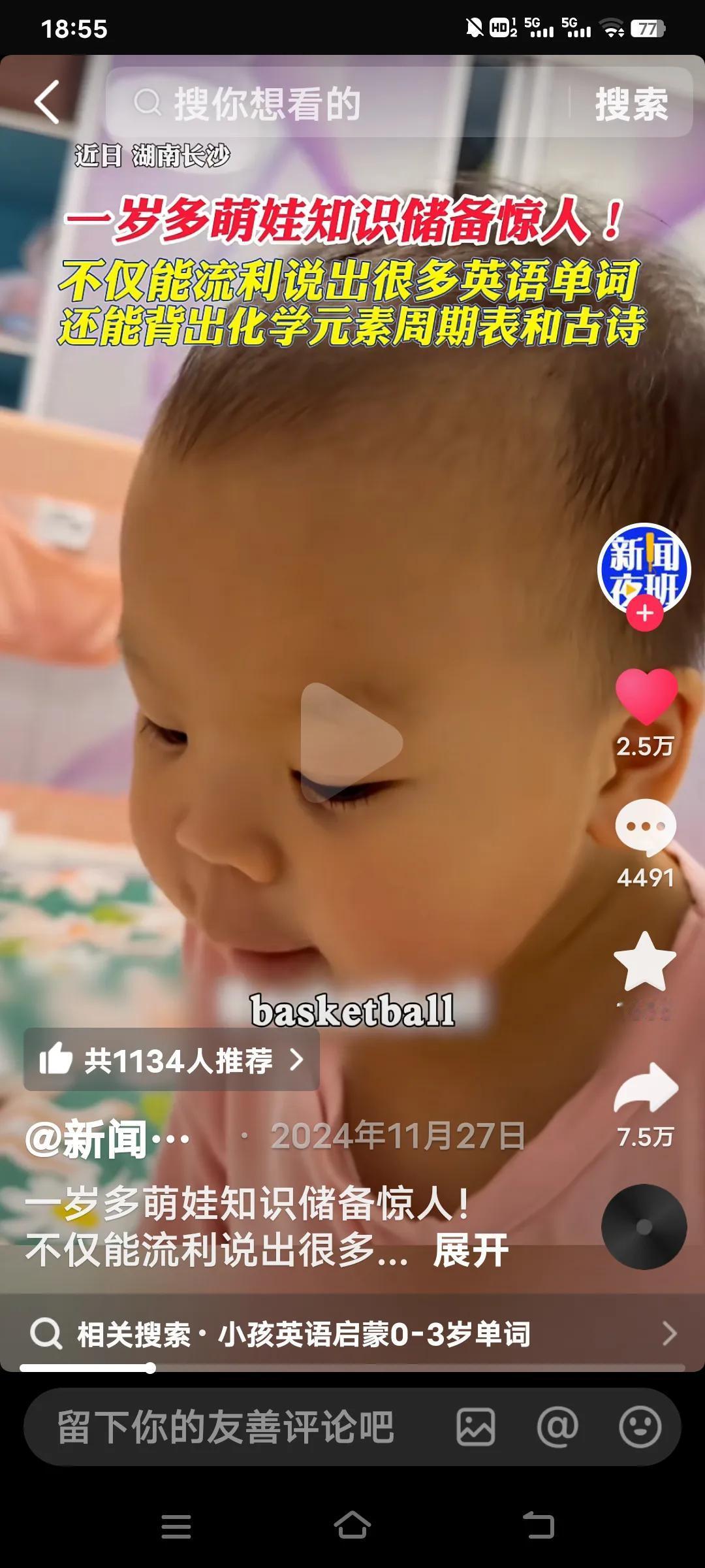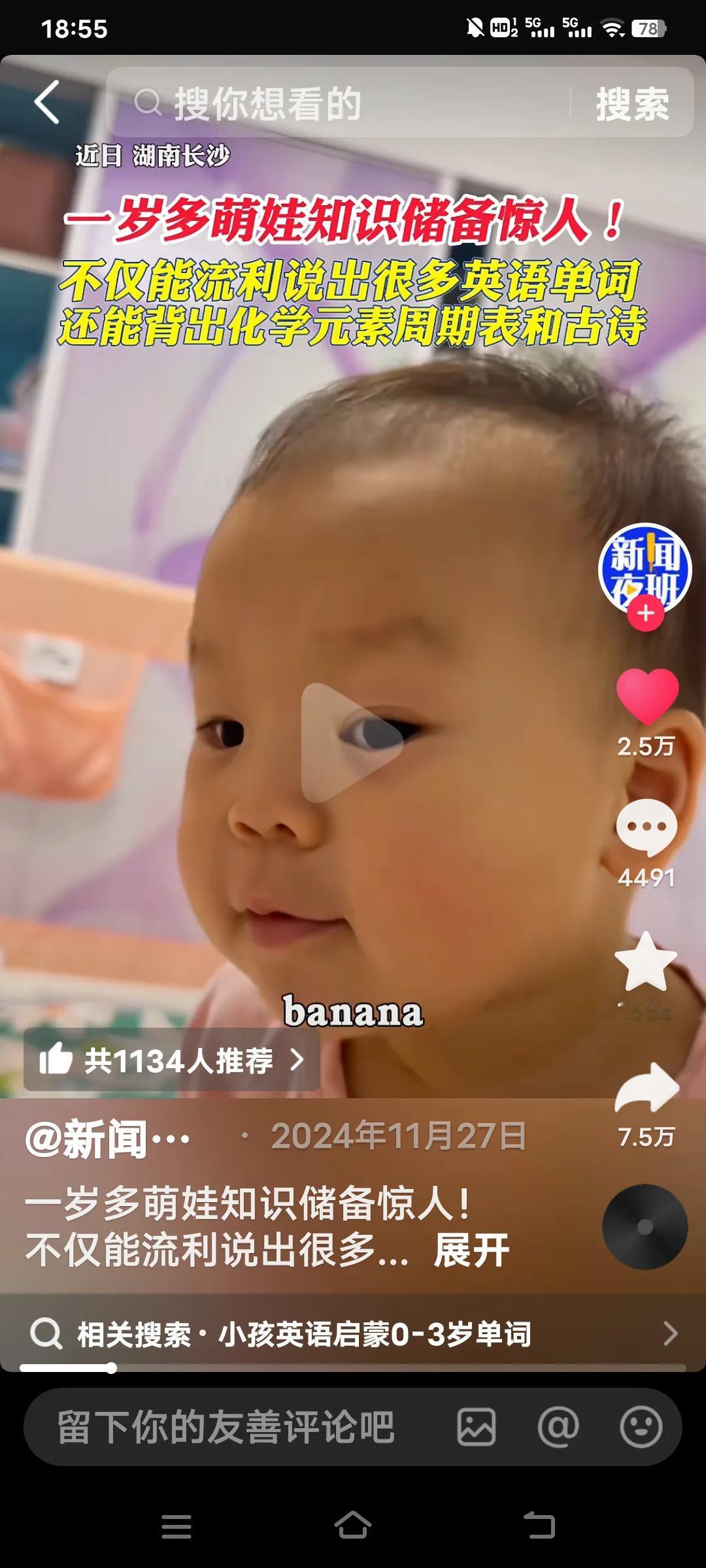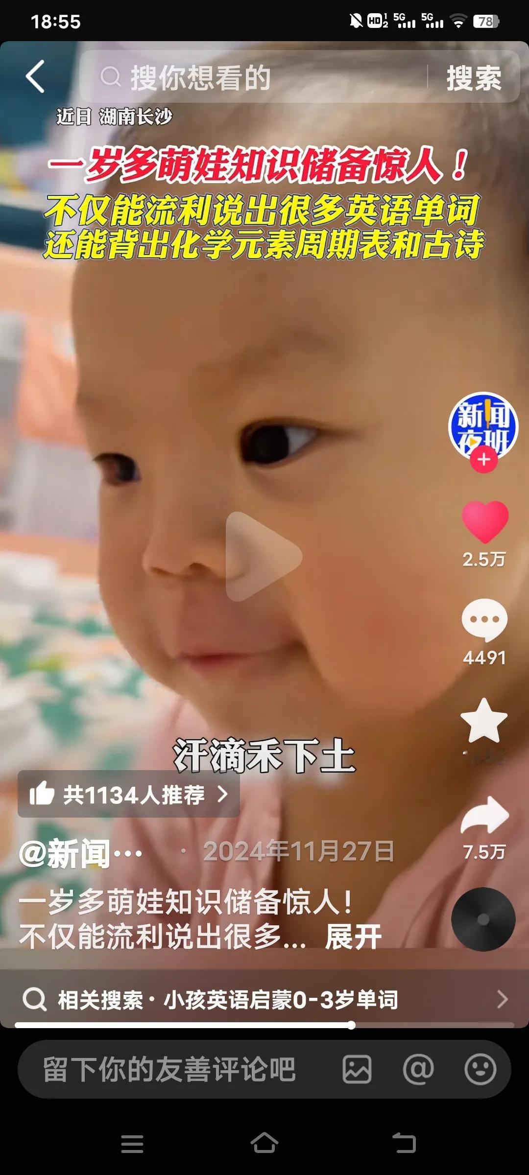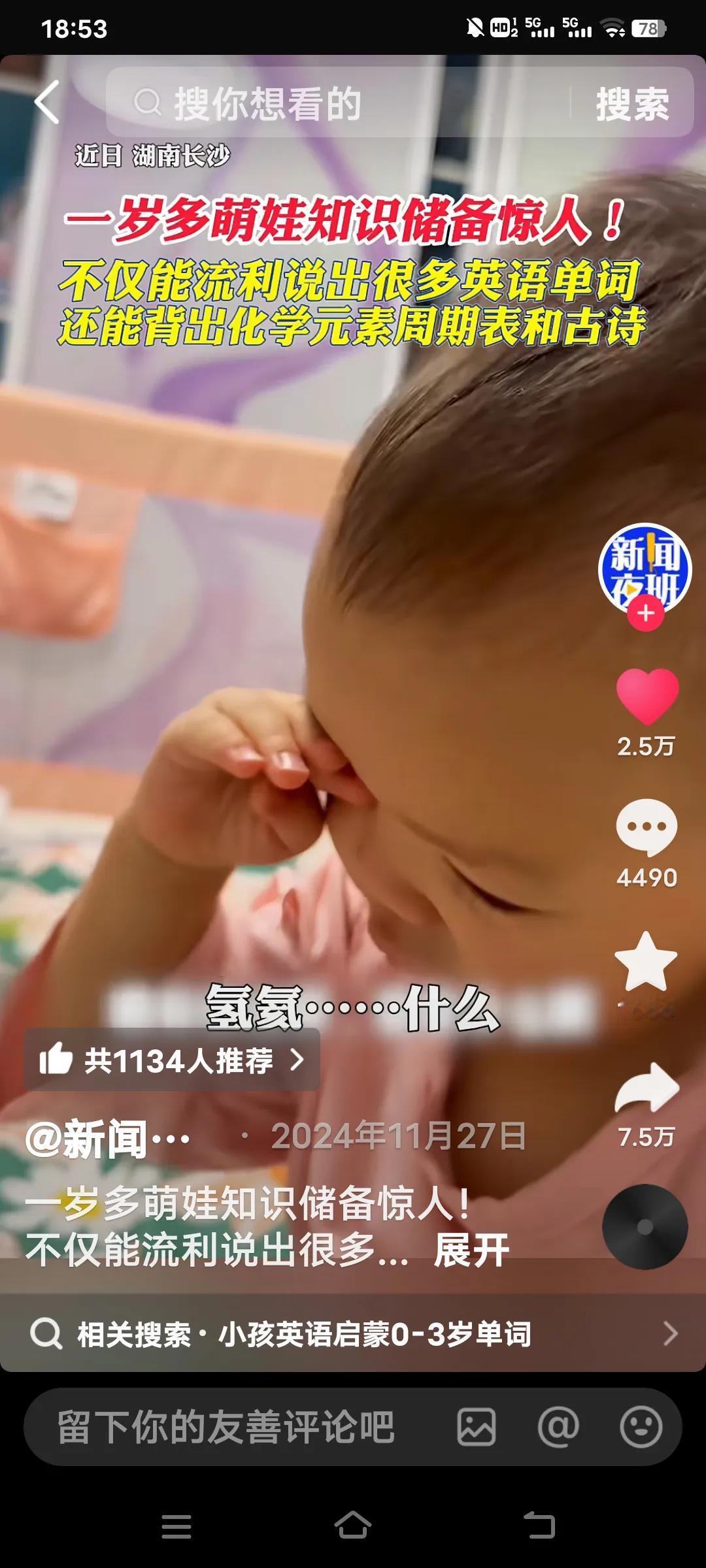 真是天才,一岁多萌娃,不仅能说出很多英语单词,还能对答如流的背很多古诗。以及化学元素周期表。 据说到学校上幼儿园老师教不导她,她的爸爸也感觉懵了。在家里也没人教过她呀!可是当她的爸爸考她时,地铁,她用英语答了,香蕉,西瓜等,她都能用英语讲出。 比如锄禾日当午,她就能接,汗滴禾下土,谁知盘中餐,粒粒皆辛苦等之类的,这都是小学一年级的时候才能学到的呀!太不现实了耶!她就是会了!一年级娃学英语 小男孩学英语 小男孩学英语 英语一年级
