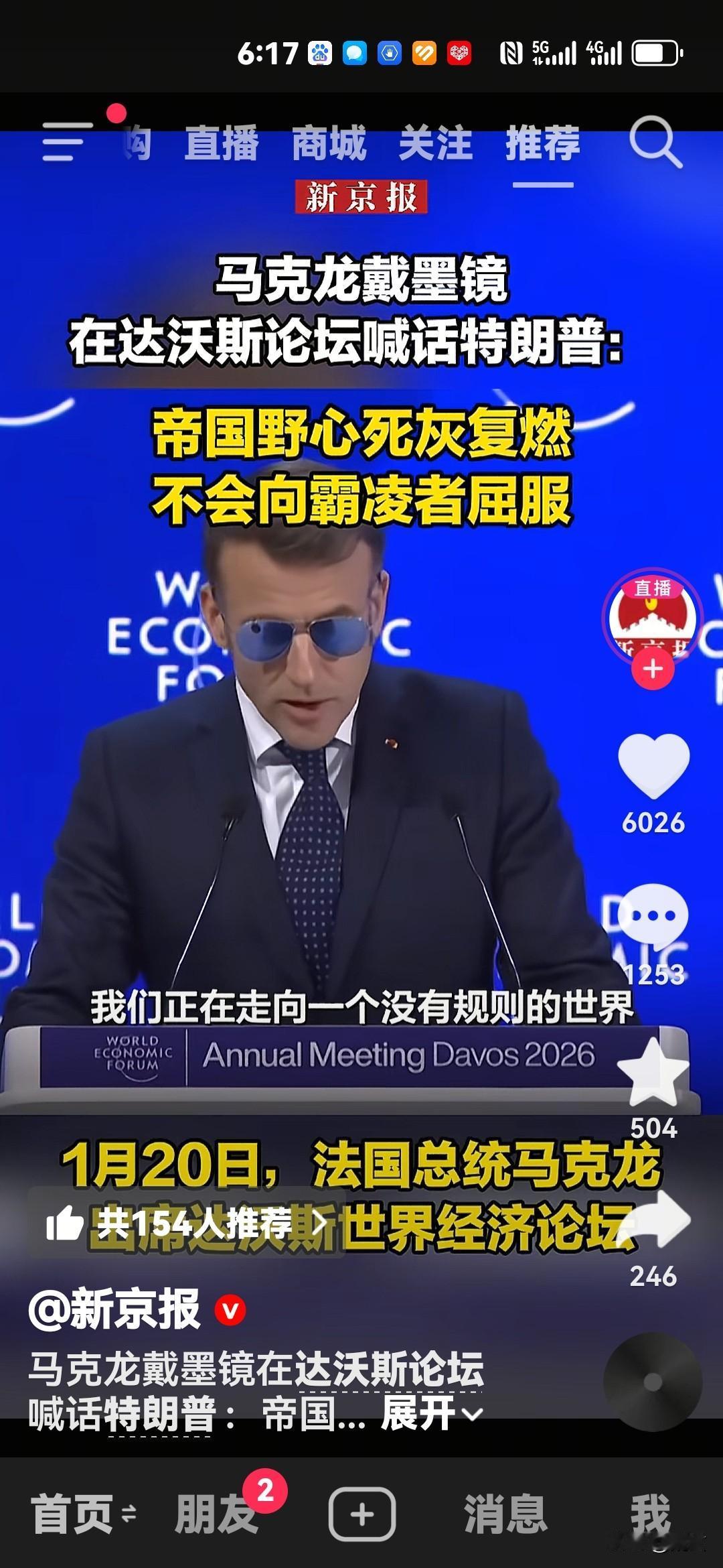 马克龙墨镜下的那点秘密。 小马哥在如此重要的国际性场合演讲戴墨镜,也是大姑娘上轿头一遭。 为何如此呢?估计是怕露底。 俗话说眼睛是心灵的窗户,小马哥大抵是怕自己一脸的威严霸气,被扑朔迷离的眼神漏了底,被人看出他外强中干,色厉内荏的本色。 就法国那点底子,拿什么与特朗普对抗呢?不过是台面上说两句硬气话,私底下再服软勾兑一下,面子里子都有了,如此而已。